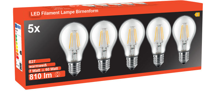 Die LED Filament Lampe Birnenform ist ausgestattet mit 7 Watt und kommt, wie der Name bereits vermuten lässt, in altbewährter Birnenform. Wie bei herkömmlichen Lampen ist auch die, auf LED-Technologie basierende Variante, mit einem handelsüblichen E27 Sockel bestückt, der das Leuchtmittel vielseitig einsetzbar macht. Somit findet die LED Filament Lampe Birnenform überall dort Anwendung, wo eine E27 Fassung vorhanden ist. Jetzt auch als 5er Vorteilspack erhältlich.