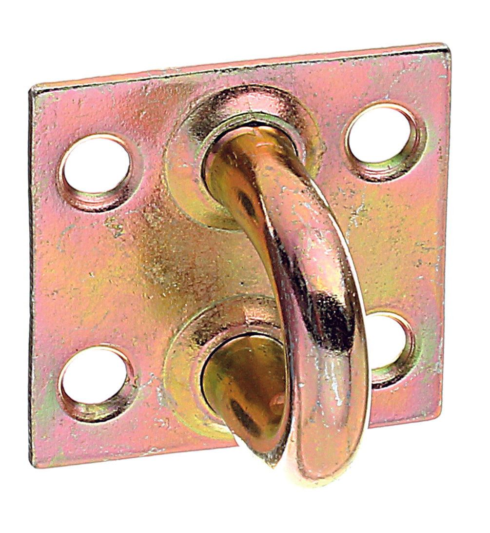 Öse auf Platte, Material: Stahl roh, Oberfläche: galvanisch gelb verzinkt, Plattenlänge: 37 mm, Plattenbreite: 37 mm, Bügel-#: 7 mm, Bügelbreite: 27,5 mm, Bügelhöhe: 27 mm, Materialstärke: 2,00 mm, Anzahl Löcher: 4, Loch: #5,5 mm