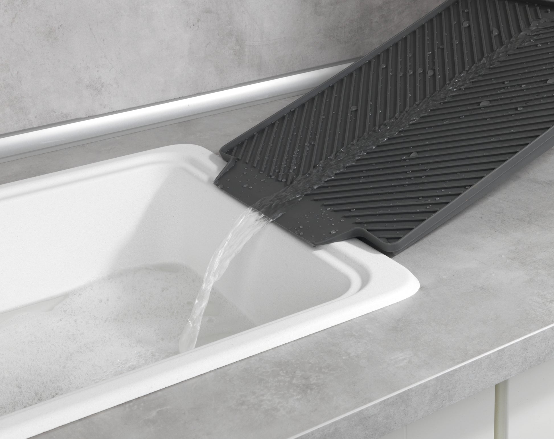 Upgrade für Ihre Küche: Mit der WENKO Abtropfmatte Linea trocknet das Geschirr und Besteck ohne Kalkränder und Wasserflecken. Zudem werden lästige Kratzer auf der Spülablage und Gläsern vermieden sowie das Spülbecken seitlich im Handumdrehen erweitert. Das nasse Geschirr wird einfach nach dem Abwasch auf die Geschirrmatte gelegt. Durch die geneigte Fläche fließt das Spülwasser optimal ab. So verhindern Sie Pfützen auf der Ablagefläche und Kalkränder an Gläsern. Das Spülgut trocknet schneller. Die praktische Geschirr-Abtropfmatte ist aus robustem Kunststoff (TPR) gefertigt und im trendigen Grau gehalten. Natürlich bietet WENKO noch viele weitere clevere Küchenhelfer im passenden Grau an. Dieser Look macht die Küche zum wahren Wohlfühlort.