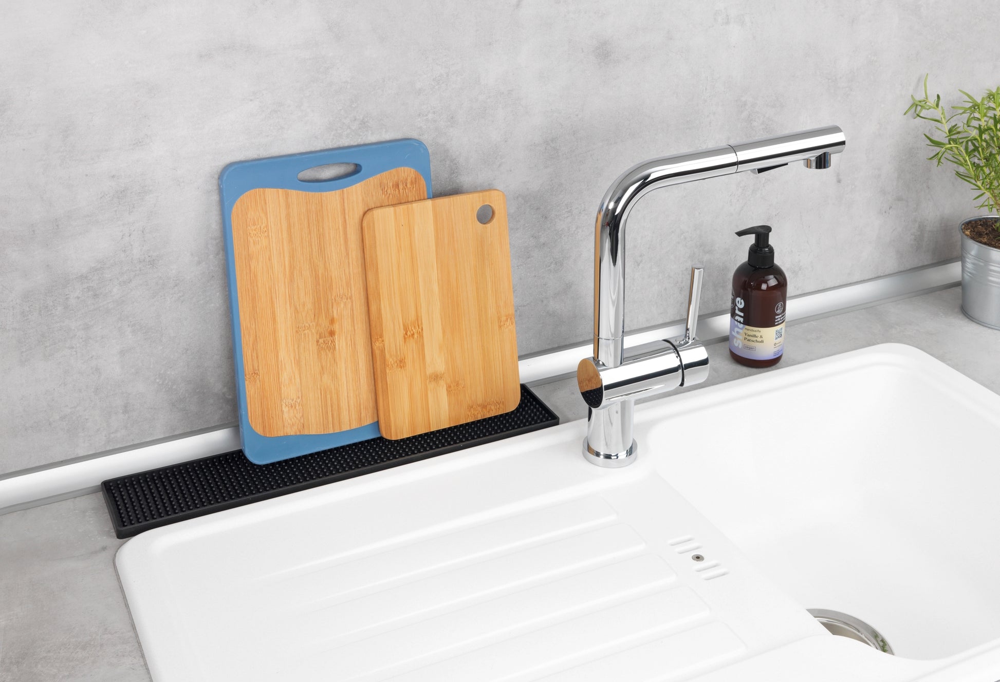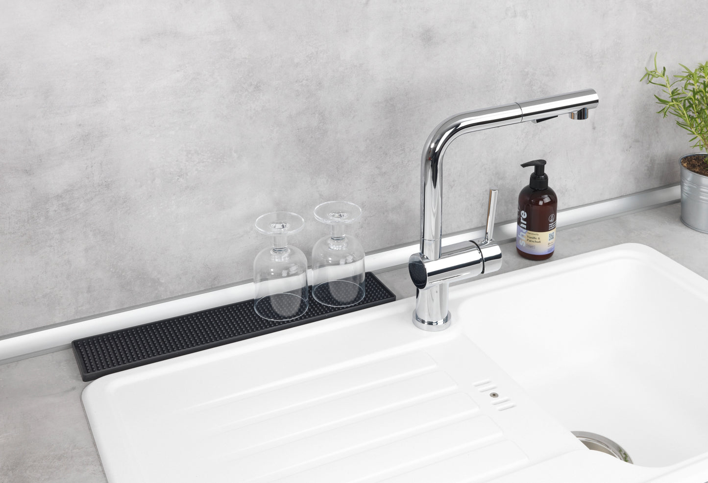 Die hochwertige Abtropfmatte Slim ist ein idealer und praktischer Helfer in der Küche. Durch ihre robuste Qualität schont sie den hochwertigen Untergrund vor hässlichen Kratzern und verhindert das Verrutschen des Geschirrs. Tassen und Gläser, Geschirr, Besteck oder Töpfe werden sanft und sicher zum Trocknen auf der weichen Oberfläche gelagert. Die Matte besticht durch ihre hochwertige, schwarze Optik kombiniert mit optimaler Wasser-Ablaufqualität. Durch ihre schlanke Form passt die Geschirrmatte optimal neben die Spüle oder zwischen Spüle und Wand, wodurch die Matte auch ideal zum Abtropfen von Brettchen geeinigt ist.