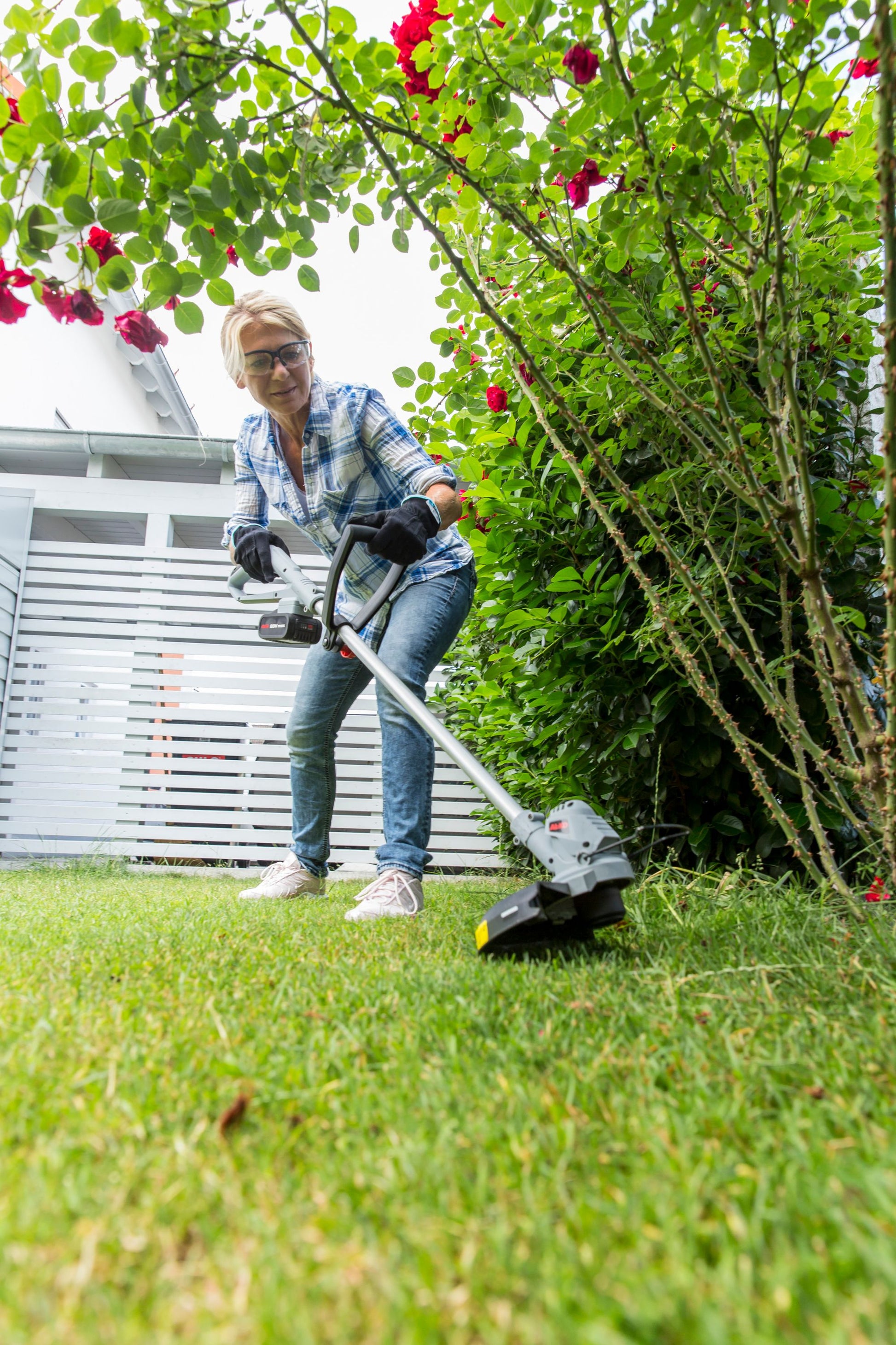 Mit nur 1,9 kg inkl. Akku und ergonomisch verstellbarem Zusatzgriff ist der AL-KO GT 2000 der hochmobile, leicht bedienbare Helfer für jeden Gartenbesitzer. Mit einer Schnittbreite von 25 cm sorgt der Trimmer für präzises Arbeiten an der Rasenkante, unter Büschen und an Wänden. Der 20 V starke Li-Ion Akku mit hoher Lebensdauer ist in ca. 50 min aufgeladen. Automatische Fadennachstellung. Der klappbare Pflanzenschutzbügel schützt Blumen und Pflanzen und verhindert hohen Fadenverschleiß an Mauern und Zäunen.