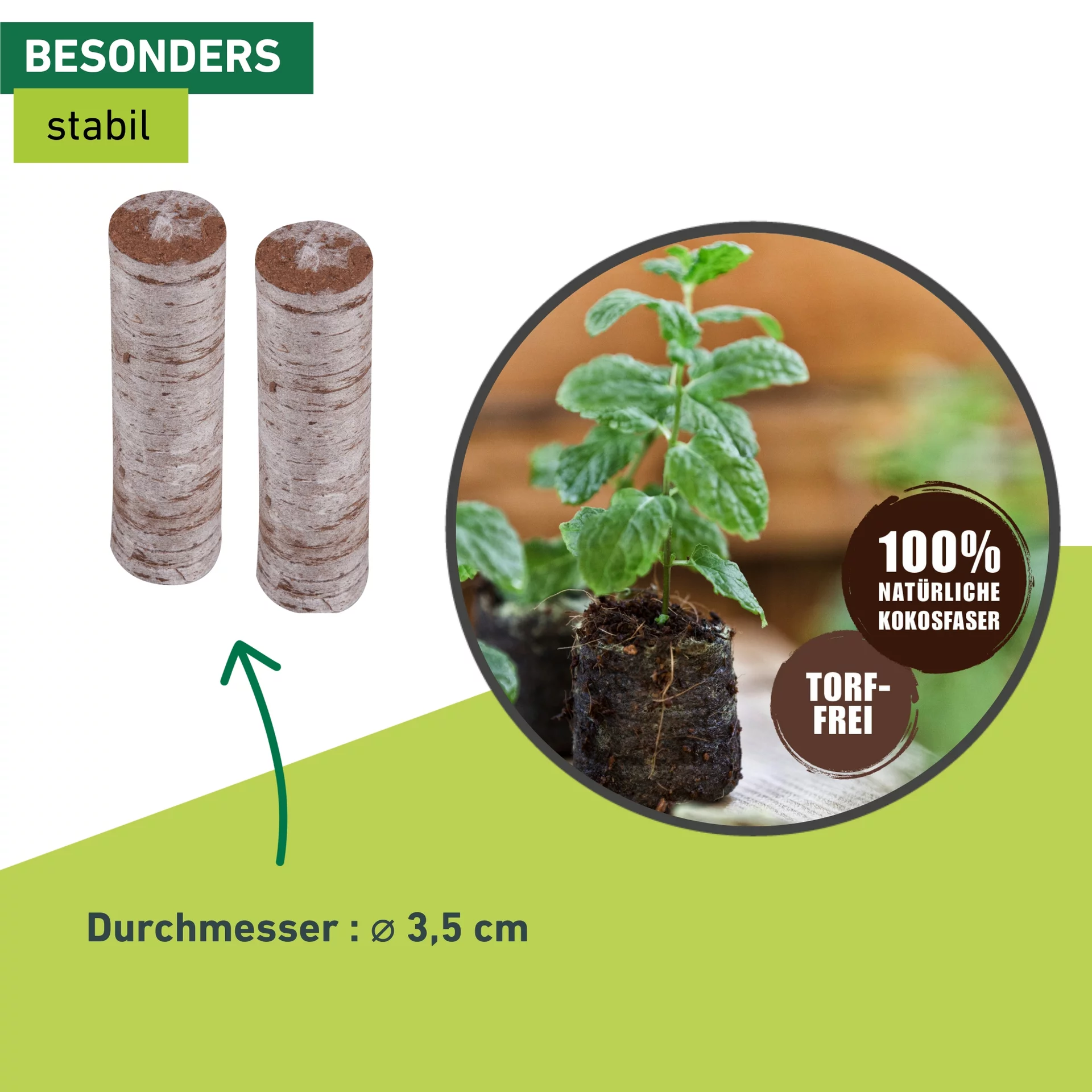Die Kokos-Quelltabletten bestehen aus natürlichen und nachwachsenden Rohstoffen. Sie sind zur Gänze frei von Torf und somit ideal für den natürlichen und nachhaltigen Garten geeignet. Für besseren Halt und eine reibungslose Anzucht sind die Tabs von einem feinmaschigen Vliesmantel umgeben, welcher vor dem Auspflanzen entfernt werden sollte.