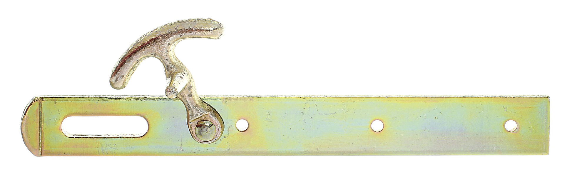 Überfalle mit Haken, Material: Stahl roh, Oberfläche: galvanisch gelb verzinkt, Länge Überfalle: 250 mm, Breite: 30 mm, Abstand Mitte Langloch - Ende Überfalle: 112 mm, Materialstärke: 3,00 mm, Anzahl Löcher: 1 / 3, Loch: 10 x 40 / #5,5 mm