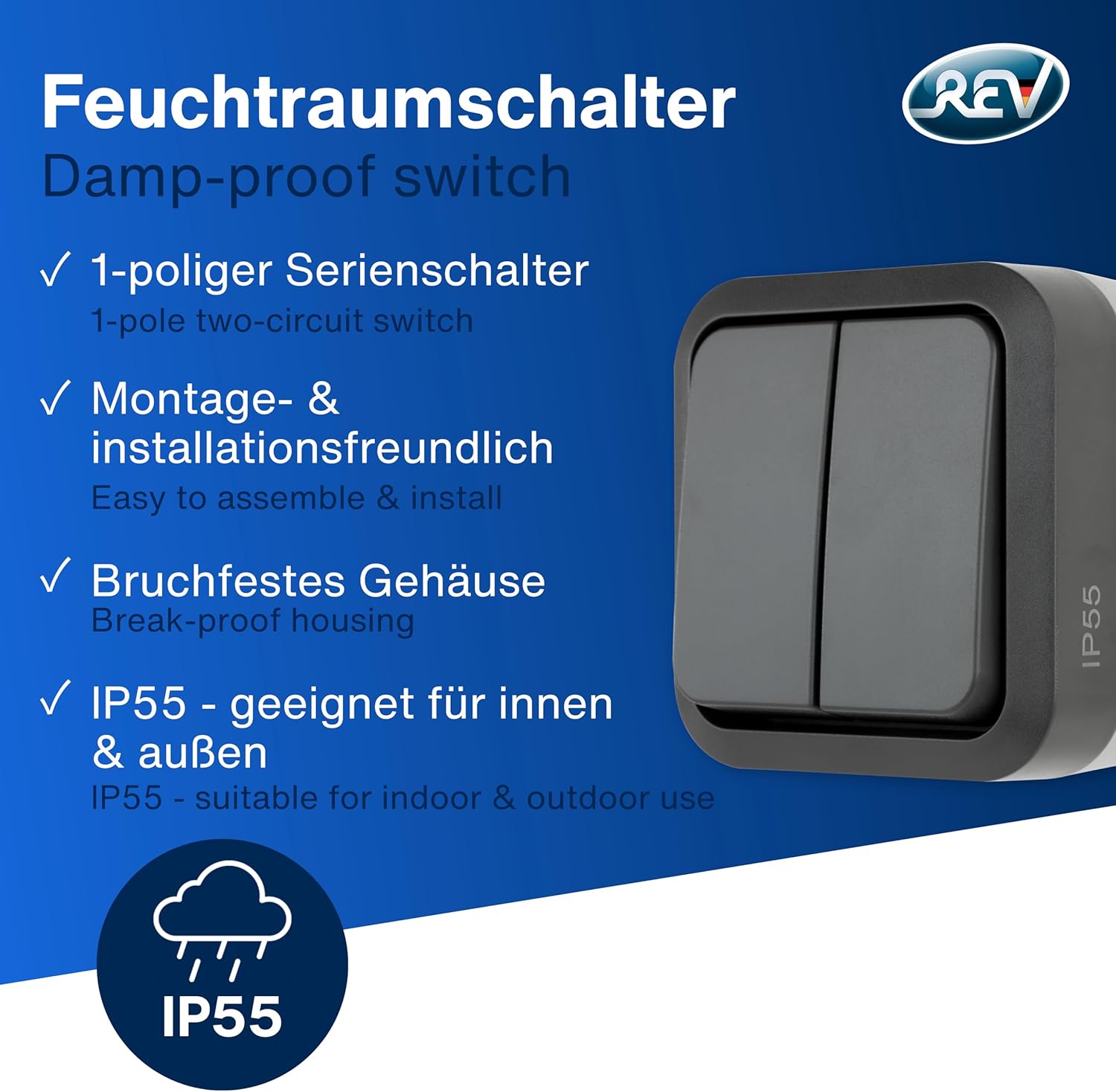 Der IP55‑Serienschalter aus der Aquastorm‑Reihe von REV ist für den Betrieb in Außenbereichen und feuchten Umgebungen ausgelegt. Mit seinem robusten Gehäuse bietet er Spritzwasserschutz und ist ideal zur Steuerung mehrerer Lampen über eine zentrale Schaltstelle geeignet.