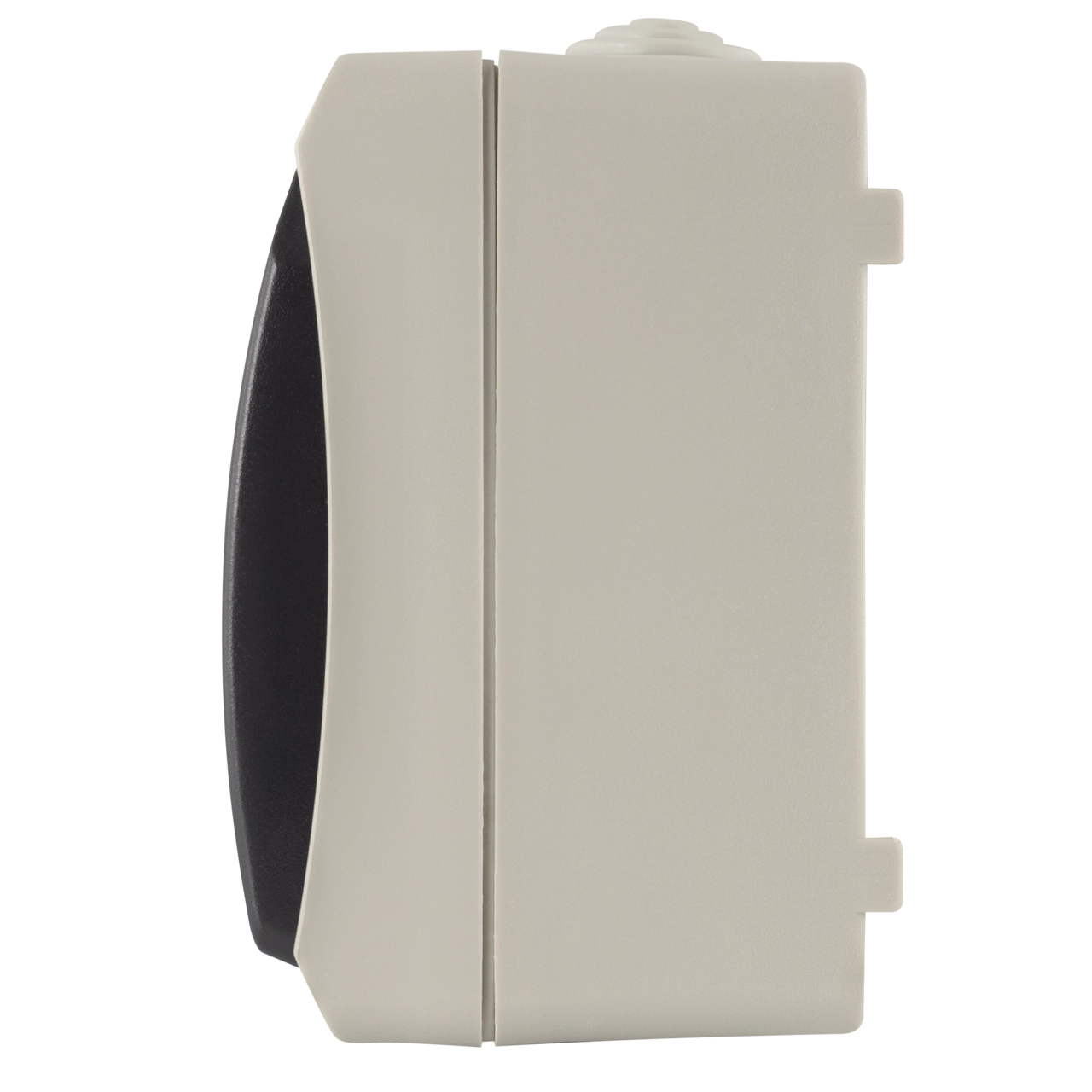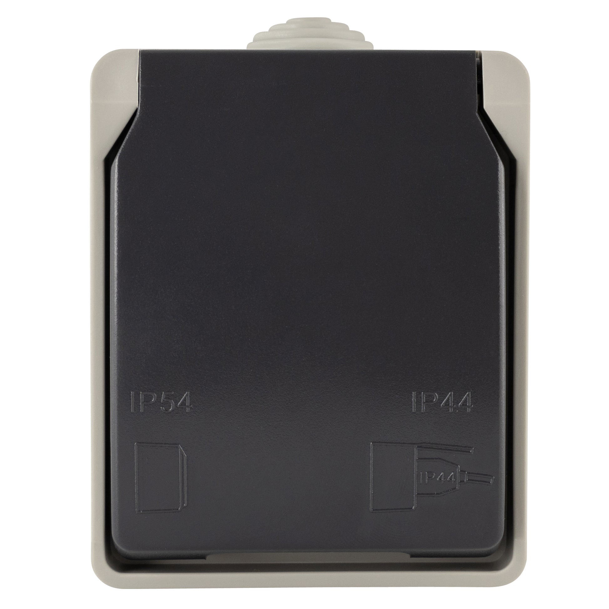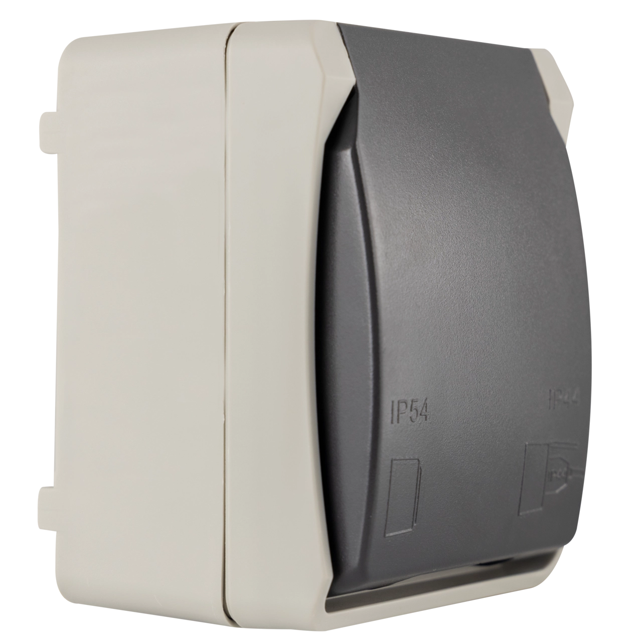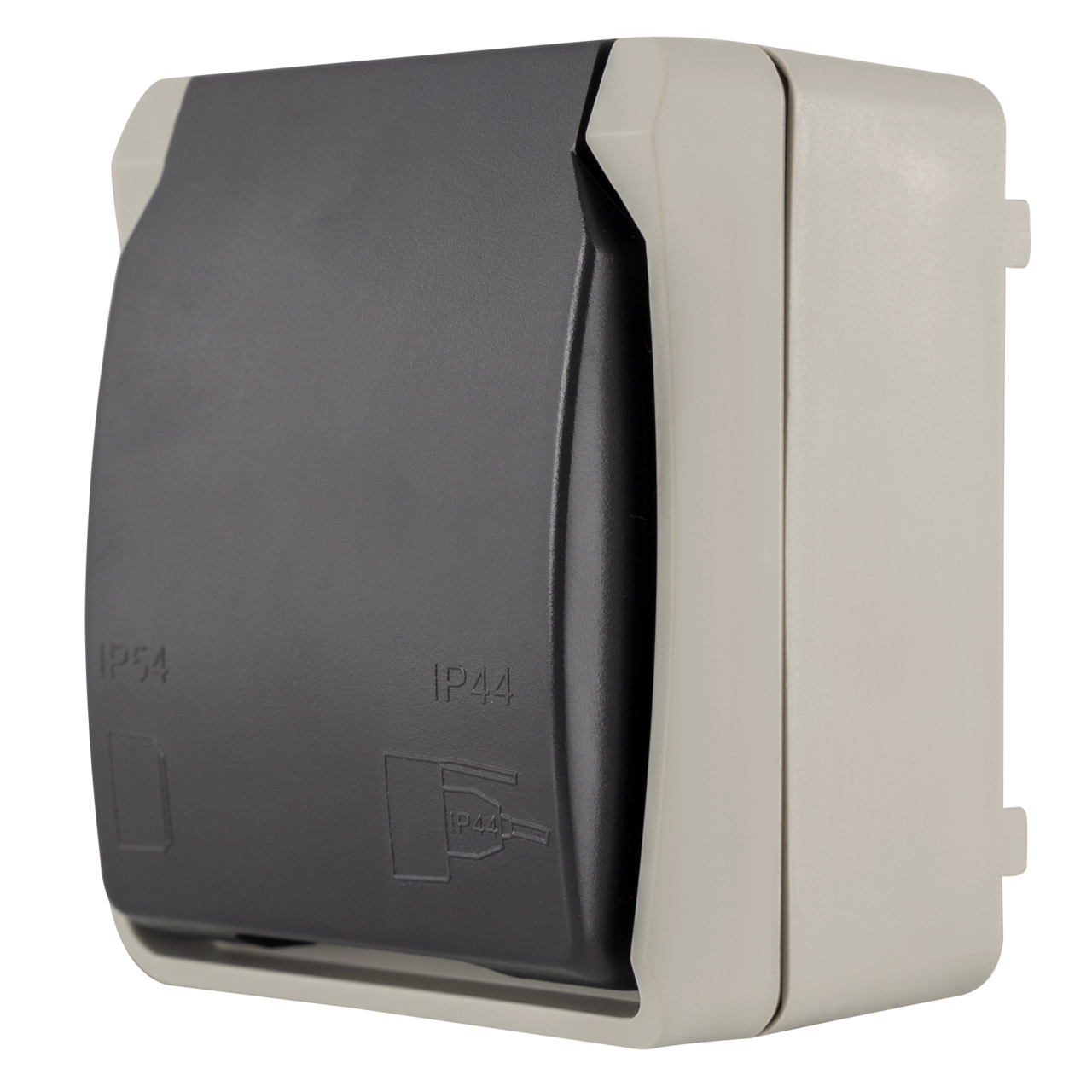 Diese Aufputz-Steckdose aus der Aquabase-Serie von REV ist speziell für den Einsatz in Feuchträumen und im Außenbereich konzipiert. Mit der Schutzart IP44 ist sie spritzwassergeschützt und bietet eine sichere Stromversorgung unter widrigen Bedingungen. Das graue Gehäuse fügt sich dezent in viele Umgebungen ein, und das Design ist Teil des modularen Aquabase-Systems.