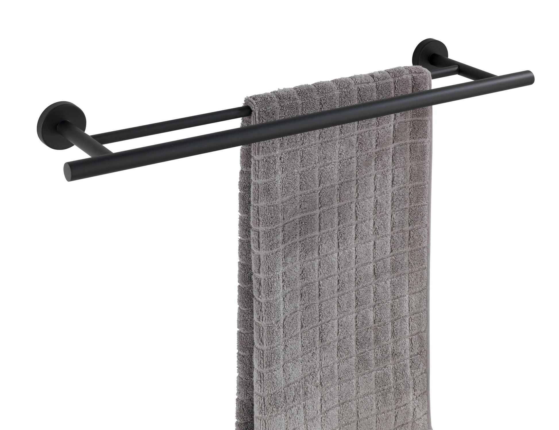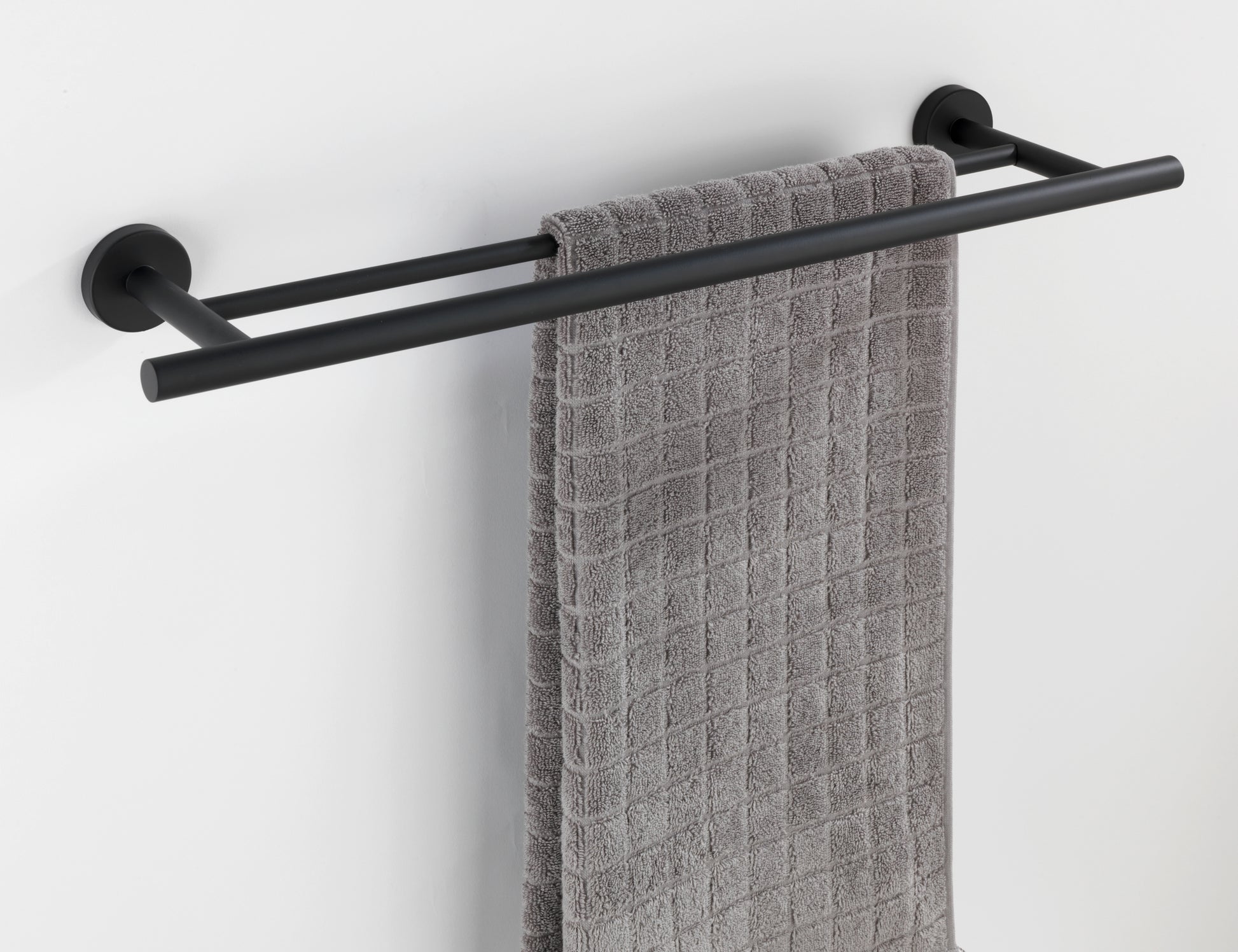In einem liebevoll eingerichteten Zuhause darf es auch an Ordnung nicht fehlen. Am schönsten ist es, wenn im Badezimmer alles seinen Platz hat. Hier beginnt der Tag – und das möglichst ohne Stress und langes Herumsuchen dank WENKO. Die trendige Bad-Serie Bosio Black im Industrial Style von WENKO verleiht allen Räumen das gewisse Etwas. Mit ihrem geradlinigen Design und ihrer starken Präsenz schaffen die Accessoires den idealen Kontrast zu hellen Bädern. Die hochwertige Badetuchstange Duo mit ihrer schweren, massiven Qualität besteht aus zwei parallel laufenden, extra langen Aufhängestangen und bietet viel Platz für zwei Badetücher oder mehrere kleine Handtücher. So kann jedes Badetuch vernünftig trocknen und hat immer einen griffbereiten Platz im Badezimmer oder Gäste-WC. Der elegante Handtuchhalter ist aus rostfreiem Edelstahl in elegantem Schwarz matt gefertigt. Verleihen Sie Ihrem Bad einen komplett neuen Look mit den vielen weiteren Bad-Accessoires der Bosio Black Serie. Die passenden Schrauben und Dübel zur stabilen Wandbefestigung sind im Lieferumfang bereits enthalten. Alternativ ist auch eine Befestigung ohne Bohren möglich. Separat erhältlich ist das Power-Loc Klebe-Set. Das Power-Loc Kammer-Klebesystem zeichnet sich durch extrem festen Halt auf allen tragfähigen Oberflächen, z.B. Fliesen, Naturstein, Glas, Beton, Metall, Holz und vielen Kunststoffen aus. Das Befestigungssystem hält problemlos auch auf rauen und leicht unebenen Oberflächen.