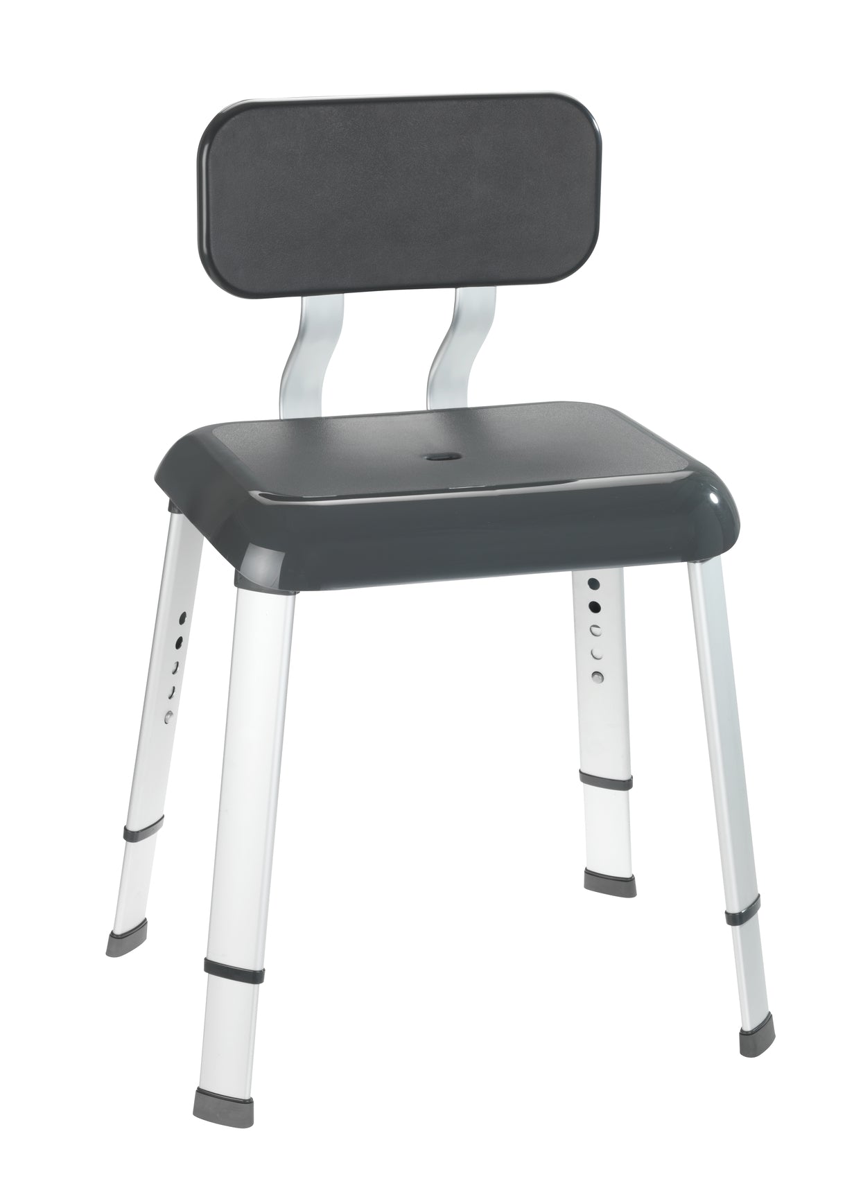 Die hochwertigen Secura Premium Produkte von WENKO sorgen für größtmögliche Sicherheit im Badezimmer und erleichtern den Alltag bei der täglichen Hygiene. Dabei wurde viel Wert auf hochwertige Materialien wie rostfreies, mattiertes Aluminium in Verbindung mit rutschfesten Kunststoffelementen in Anthrazit und moderne Optik gelegt. Der stabile Design Badhocker Secura Premium mit Rückenlehne sorgt für mehr Badevergnügen und Sicherheit, denn der komfortable Duschhocker erleichtert das Baden und Duschen. Der bequeme und sichere Sitz ist nach den neuesten Vorschriften durch den TÜV getestet und TÜV/GS zertifiziert. Mit vier stabilen Standfüßen aus Aluminium, die mit rutschhemmenden Kunststoffkappen überzogen sind, steht der praktische Hocker stets sicher auf dem Boden. Dabei verfügt er eine Tragkraft bis zu 130 kg. Der Duschsitz verfügt über eine rutschhemmende, strukturierte und extra große Sitzfläche für noch mehr Komfort und Sicherheit. Die bequeme Sitzfläche ist mit einer großen Öffnung versehen, die einen vollständigen Wasserablauf ermöglicht. Die rutschhemmend-strukturierte Rückenlehne sorgt für sicheren Halt und erleichtert das Aufstehen. Die stylischen Füße sind 5-fach höhenverstellbar und ermöglichen so eine optimale Sitzposition beim Duschen.