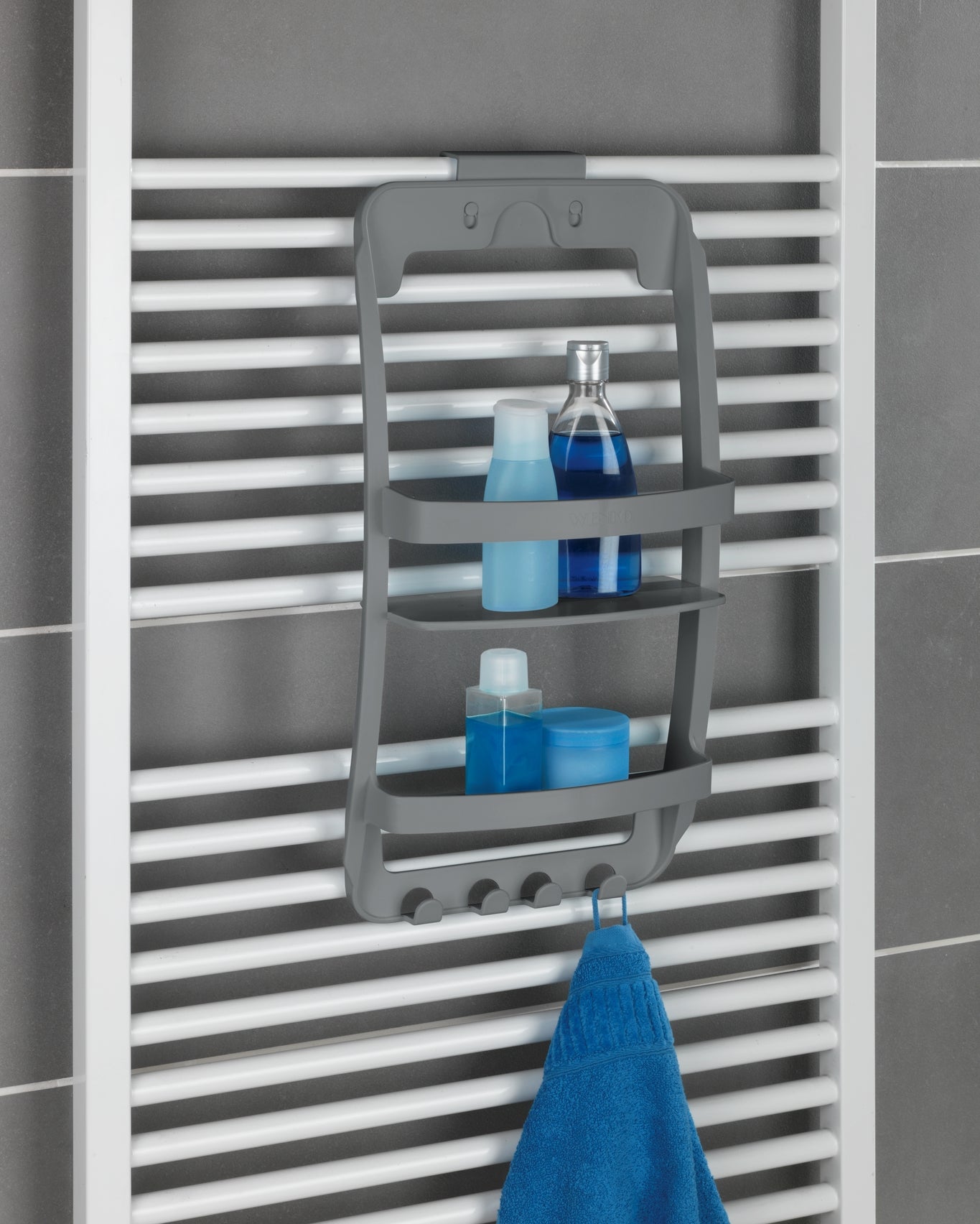 Für mehr Ordnung im Bad – das Badregal Universal von WENKO ist die clevere Lösung für jedes Badezimmer, wenn es um die ordentliche Unterbringung Ihrer Badutensilien geht. Die praktische Badaufhängung ist aus stabilem Kunststoff gefertigt. Das Material zeichnet sich durch Strapazierfähigkeit und Langlebigkeit aus. Auf 2 Ebenen bietet der geschickte Helfer die Möglichkeit, Lotion, Deo und Cremes geordnet unterzubringen. Das obere Fach bietet dabei ausreichend Stellfläche und Luft nach oben, bestens geeignet für höhere Badaccessoires. Zudem ermöglichen 4 Haken am unteren Ende des Utensilienhalters die Aufhängung von Duschschwämmen, Waschlappen und auch Handtüchern. Das anwendungsorientierte Badzubehör misst (B x H x T): 26 x 54,5 x 11,5 cm, das Maß der Aufhängung ist 2,7 cm. Eine Hängeeinrichtung zum Befestigen an Duschwänden oder Handtuchheizkörpern ist vorhanden. Wahlweise können Sie den nützlichen Ordnungshelfer entweder mit den beigefügten Schrauben und Dübeln anbringen oder ihn alternativ mit doppelseitigem Klebeband ohne zu bohren befestigen. Auch ohne Stellfläche haben Sie so Ihre Pflegeprodukte stets praktikabel zur Hand. Schaffen Sie Stauraum mit dem anwendungsorientierten Badregal Universal von WENKO.
