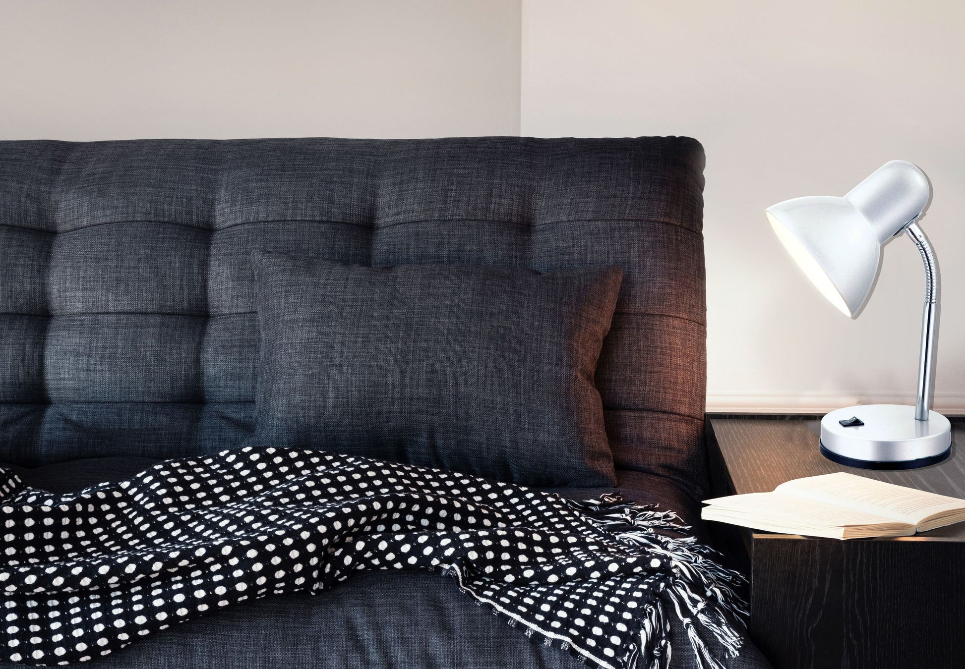 Diese Tischleuchte in Silber-Metallic-Optik bringt dank ihrer Schlichtheit ein Gefühl von Ruhe und Ordnung in jeden Raum. Dieses Modell ist mit einem praktischen Flexarm versehen und eignet sich als Nachttischlampe ebenso gut wie als Lichtquelle für den Schreibtisch. Komfortables Ein- bzw. Ausschalten wird durch einen Kippschalter am Fuß der Leuchte gewährleistet.