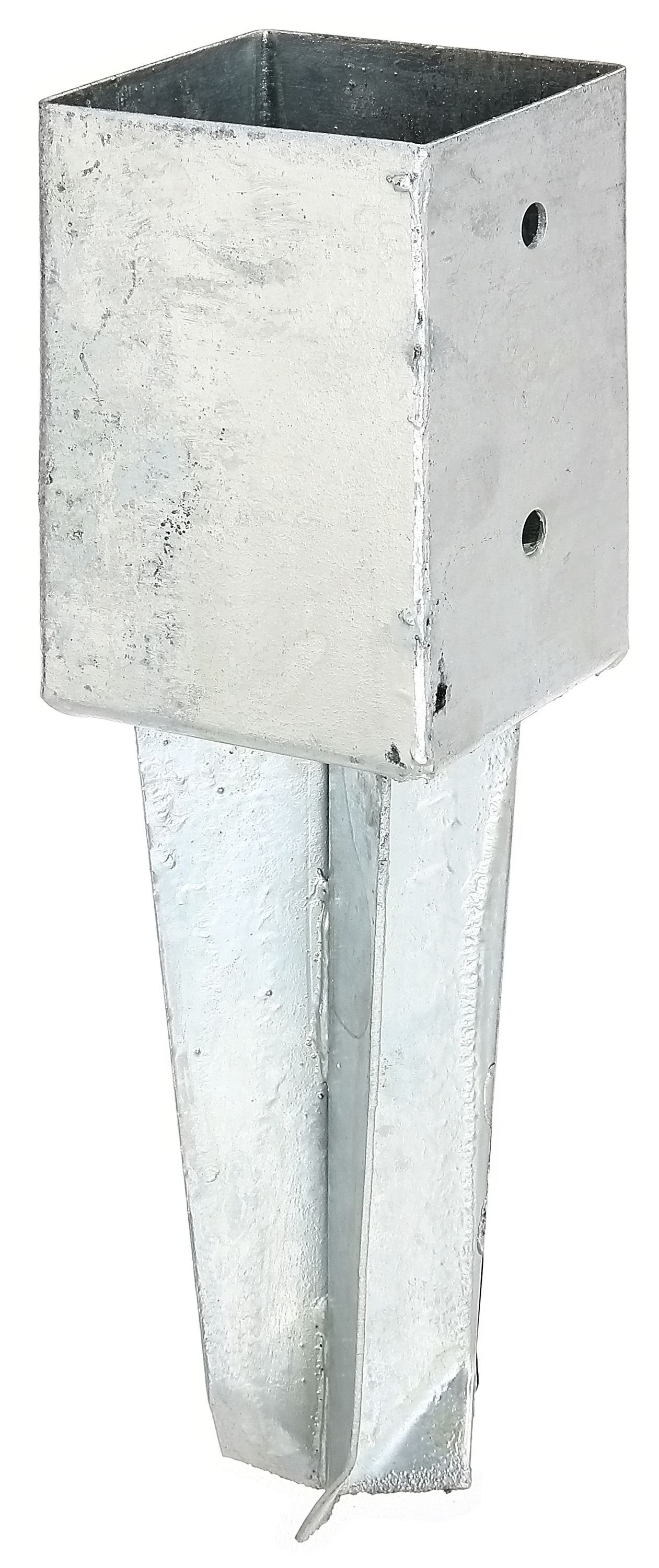 Bodenhülse für Vierkantholzpfosten, Material: Stahl roh, Oberfläche: feuerverzinkt, zum Einbetonieren, Topfbreite: 91 mm, Topftiefe: 91 mm, Topfhöhe: 150 mm, Gesamtlänge: 350 mm, Anzahl Löcher: 4, Loch: #11 mm