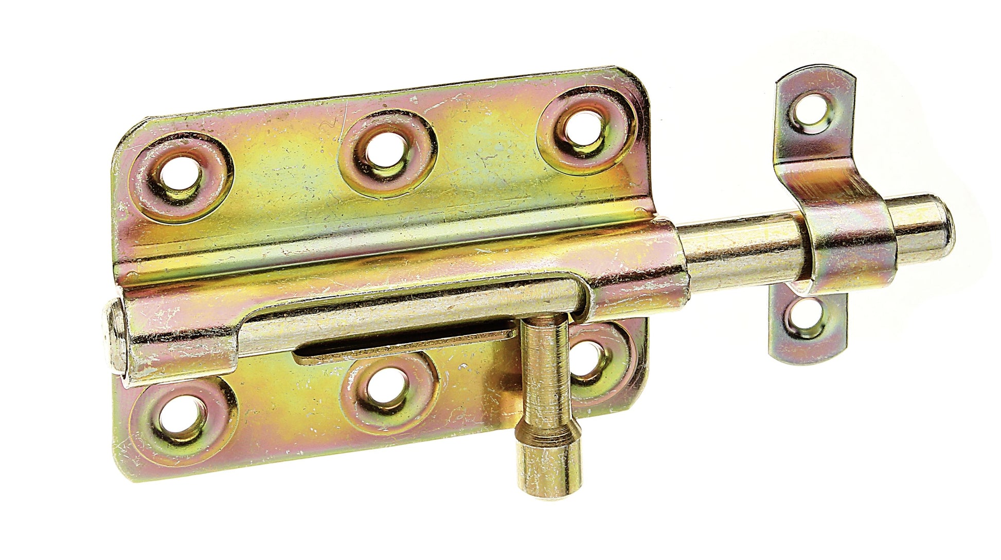 Bolzenriegel mit rundem Griff, mit versenkten Schraublöchern, Material: Stahl roh, Oberfläche: galvanisch gelb verzinkt, mit befestigter Schlaufe, Plattenlänge: 80 mm, Plattenbreite: 59 mm, Bolzen- #: 11 mm, Schlaufenbreite: 16 mm, Schlaufenlänge: 58 mm, Gesamtlänge: 125 mm, Anzahl Löcher: 6 / 2, Loch: #5,3 / #4,2 mm