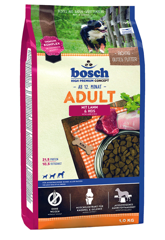 ADULT LAMM & REIS ist eine ausgewogene Vollnahrung für alle ausgewachsenen Hunde mit normaler Aktivität. ADULT LAMM & REIS enthält einen hohen Anteil an hochverdaulichem Reis (min. 16 %) und wird ohne Weizen hergestellt. Die Energieund Proteinkonzentration ist so gewählt, dass in Verbindung mit den enthaltenen Muschelextrakten den Risiken von Übergewicht für Knochen und Gelenke vorgebeugt wird. Durch den Einsatz eines Immun-Komplexes aus Mannanen und Glucanen wird die Darmflora stabilisiert sowie das Immunsystem gestärkt. ADULT LAMM & REIS eignet sich auch für ernährungssensible Hunde.