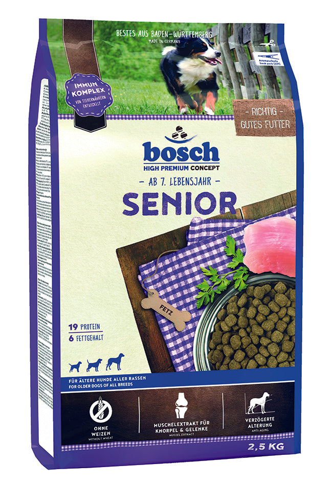 SENIOR ist stark energie-, eiweiß,und mineralstoffreduziert und kommt somit den Ernährungsbedürfnissen älterer Hunde ab dem 7. / 8. Lebensjahr entgegen. Der reduzierte Energiegehalt (nur 6 % Fett) bei gleichzeitig erhöhtem Gehalt an Ballaststoffen (6,5 % Rohfaser) verringert die Gefahr, dass ältere Hunde mit naturgemäß geringerer Aktivität an Körpergewicht zunehmen. SENIOR wird ohne Weizen hergestellt und enthält unseren Immun-Komplex aus Mannanen und Glucanen, durch den die Darmflora stabilisiert und das Immunsystem gestärkt werden.