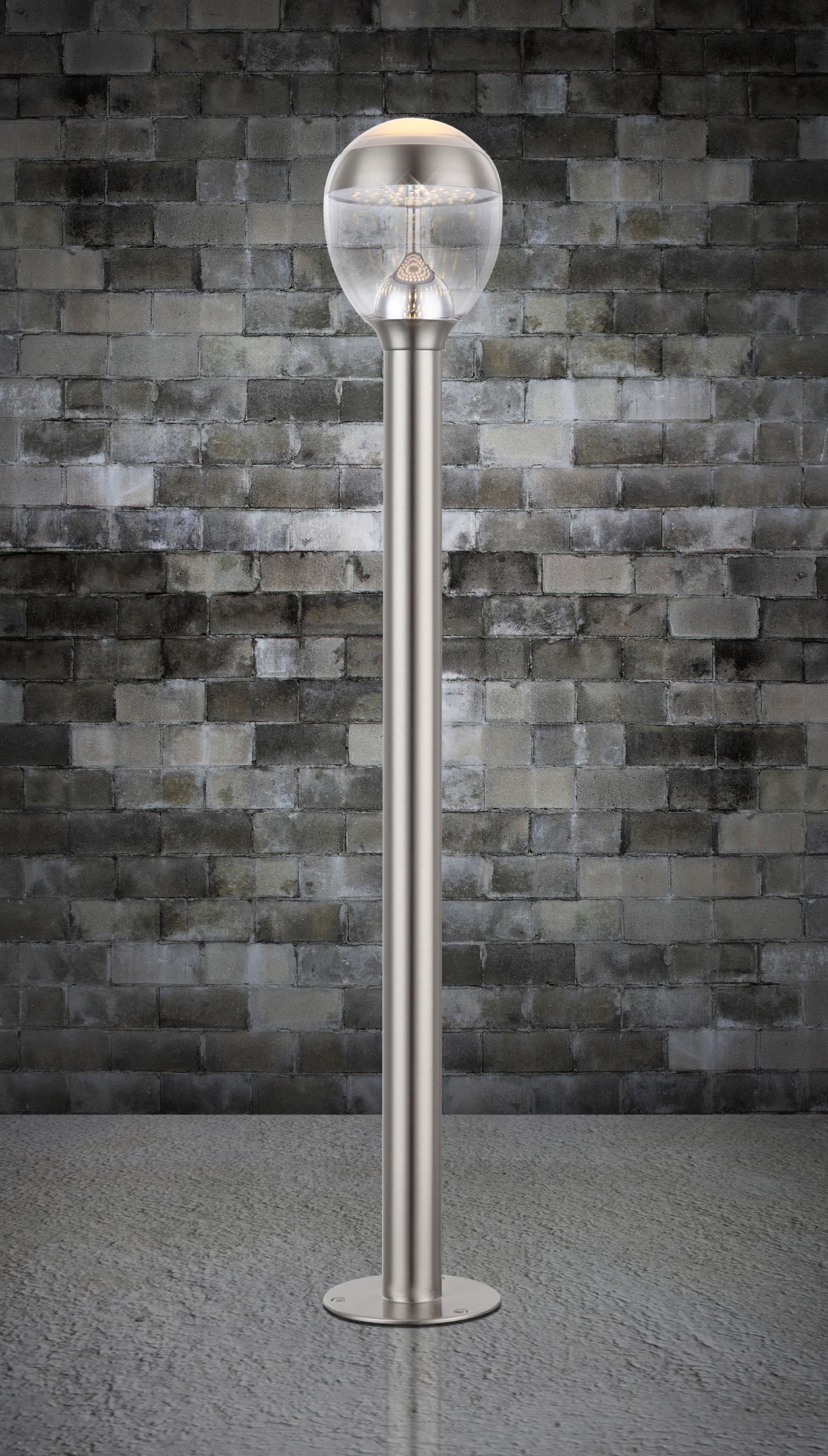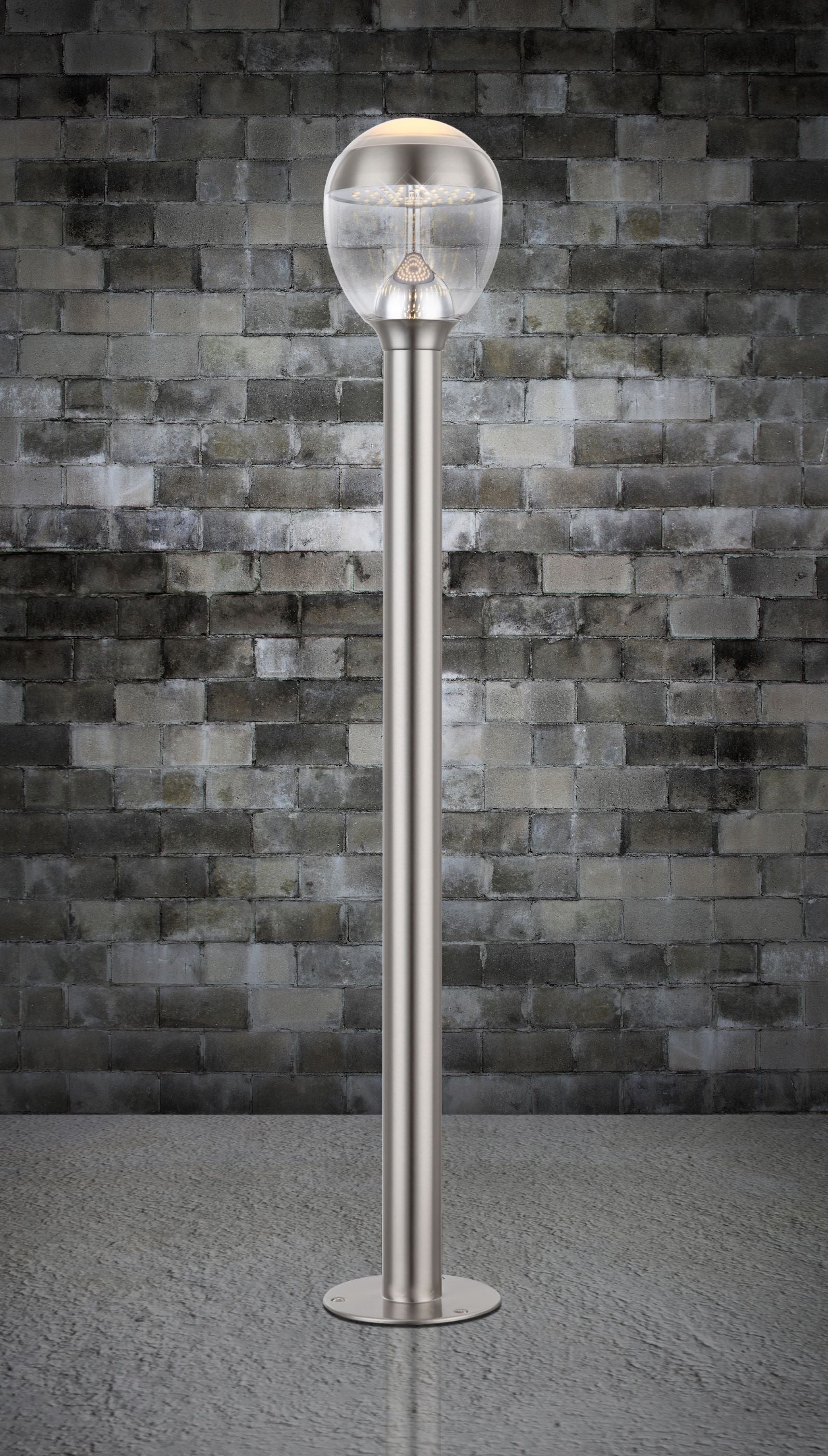 Diese Außenleuchte aus Edelstahl und klaren sowie satiniertem Kunststoff gefertigt, eignet sich besonders gut zur Beleuchtung (750 Lumen) von Wegen und Einfahrten. Gerade bei längeren Wegen wirkt es sehr schön, wenn Sie mehrere dieser Leuchten aufstellen. Aber natürlich können Sie die Leuchten auch entlang des Hauses aufstellen oder vereinzelt am Grundstück um Highlights zu setzen. Mit Ihrer IP44 Schutzart eignet sich diese knapp 1 Meter große Sockellampe hervorragend für den Außenbereich.