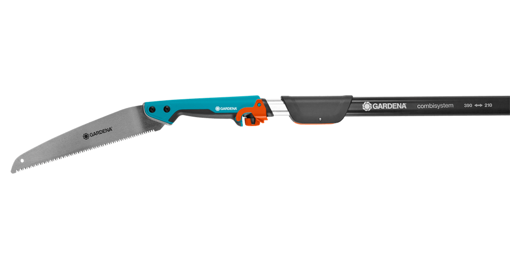 Die impulsgehärteten Zahnspitzen sorgen dafür, dass das Sägeblatt dauerhaft scharf bleibt. Der ergonomische Griff liegt angenehm und sicher in der Hand, unterstützt von Weichkomponenten und einem Abrutschstopp am Griffende, der ein sicheres Sägen gewährleistet. Diese flexible Gartensäge ist Teil des GARDENA combisystems und eignet sich hervorragend als Handsäge für gut erreichbare Äste. Wenn höhere Baumregionen erreicht werden müssen, kann sie problemlos mit dem separat erhältlichen combisystem-Teleskopstiel kombiniert werden, der durch eine wackelfreie Verbindung überzeugt.