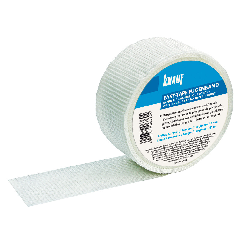 Knauf easy-tape Fugenband ist Ihr praktischer Helfer beim Verfugen von Knauf Gipsplatten an Wand und Decke. Es wird auf die Fuge aufgeklebt, um sie zu stabilisieren. Zudem vermeidet das Fugenband Risse, die während der Spachtelarbeiten an den Gipsplatten entstehen können. Das 48 mm breite Knauf easy-tape Fugenband ist selbstklebend, was Ihnen die Verarbeitung erleichtert: Ein Vorspachteln ist nicht notwendig, das easy-tape von Knauf haftet ganz von selbst. Ein weiterer Vorteil liegt in dem offenen Gewebe. Dieses ermöglicht Ihnen eine absolut blasenfreie Verspachtelung für einen möglichst sauberen und gleichmäßigen Übergang zur Gipsplatten-Oberfläche.
