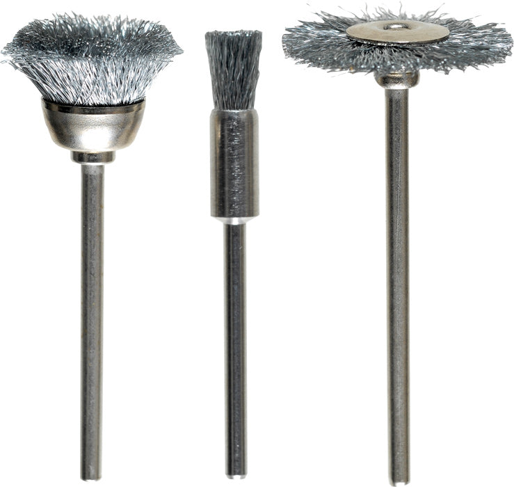 Der 3-teilige kwb Drahtbürstensatz enthält eine ø 22 mm Scheibenbürste, eine ø 18 mm Topfbürste und eine ø 5 mm Pinselbürste. Die Borsten bestehen aus gewelltem HSS Stahldraht und haben jeweils einen ø von 0.1 mm. Die Drahtbürsten sind ideal für die Feinbearbeitung und Mattierung mit Mini-Bohrmaschinensystemen, biegsamen Wellen und den Modellbau geeignet.