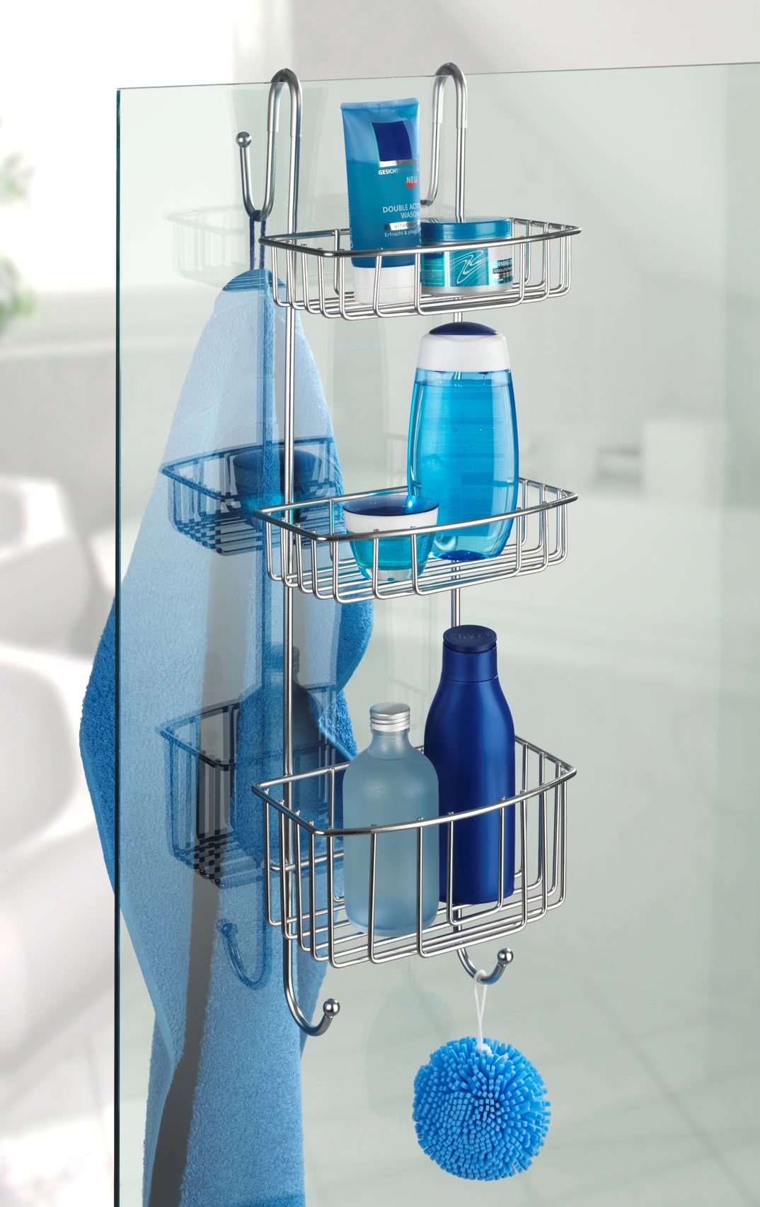 - Zur platzsparenden Aufbewahrung von Shampoo, Duschgel, Schwamm und Co.