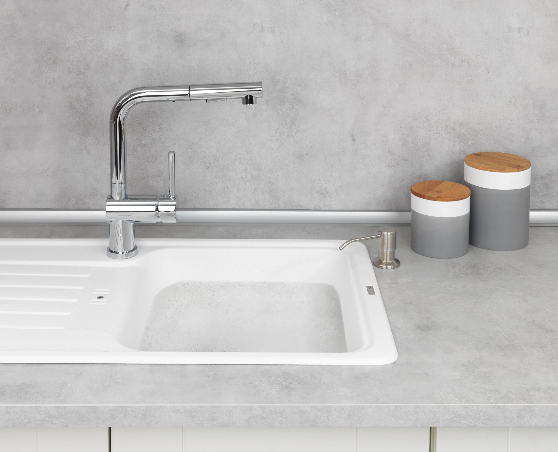 Wenn auch Ihre Küche die Seele der Wohnung ist, dann hat WENKO genau das richtige Rezept! Denn wir vereinen Funktionalität & Komfort mit den perfekten Zutaten für eine stilvolle Küche. Wir möchten, dass Ihnen die lästigen Küchenarbeiten einfach von der Hand gehen. Mit dem hochwertigen Einbau Seifen- und Spülmittelspender verleihen Sie der Spüle einen Anspruch an Ästhetik, denn der Flüssigspender wird clever am Spülbecken integriert – keine unansehnlichen Plastikflaschen stehen am Spülbeckenrand und nehmen Platz weg. Der aus hochwertigem, rostfreiem Edelstahl gefertigte Pumpenkopf ist mit einem matten Finish versehen und wird zum Hingucker neben der Küchenarmatur. Der clevere Pump-Kopf ist bequem schwenkbar und sparsam dosierbar. Durch leichten Druck auf den Dosierknopf wird die gewünschte Menge Seife, Spülmittel bzw. Lotion herausgepumpt. Der weiße Behälter aus Kunststoff für Flüssigseife, Spülmittel oder Lotion hat ein Fassungsvermögen von großzügigen 400 ml und lässt sich ganz einfach von oben befüllen. Dabei bleibt die Flasche ganz dezent unter der Arbeitsfläche oder Spüle verborgen.