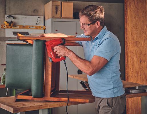 Der Elektrotacker TC-EN 20 E ist ein funktionaler Alleskönner im Haus, in der Werkstatt oder der Bastelstube. Das Verwendungsspektrum ist breit: Im Haushalt lassen sich mit dem Einhell Elektrotacker Papierstapel binden, Sitzflächen neu beziehen, Textilien befestigen oder kleinere Reparaturen erledigen. In der Hand eines Hobby-Heimwerkers eignet sich der Elektrotacker ideal für kleine und große Projekte: Gitter kleiner Ställe lassen sich problemlos fixieren, auch Folien oder Isoliermaterial können einfach befestigt werden. Eine elektronische Schlagkraftvorwahl sorgt für optimale Arbeitsergebnisse. Die Sicherheitsnase schützt vor Unfällen: Klammer- und Nagelauslösung funktionieren nur in Arbeitsstellung. Die Magazin-Füllstandsanzeige ist gut sichtbar angebracht. Bei langwierigen und intensiven Projekten beugt der ergonomische Handgriff dem Kräfteverfall vor und sorgt für ein angenehmes, ermüdungsfreies Arbeiten. Einen sicheren und komfortablen Halt hat der Anwender in jeder Lage durch den Softgrip. Die Lieferung umfasst 1000 Klammern und 500 Nägel.
