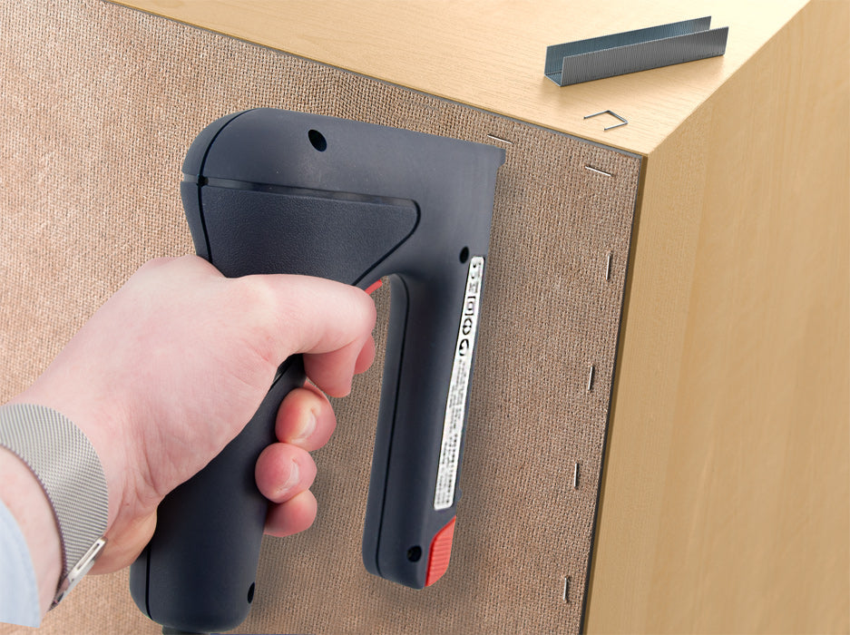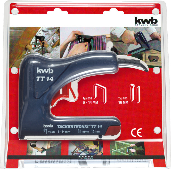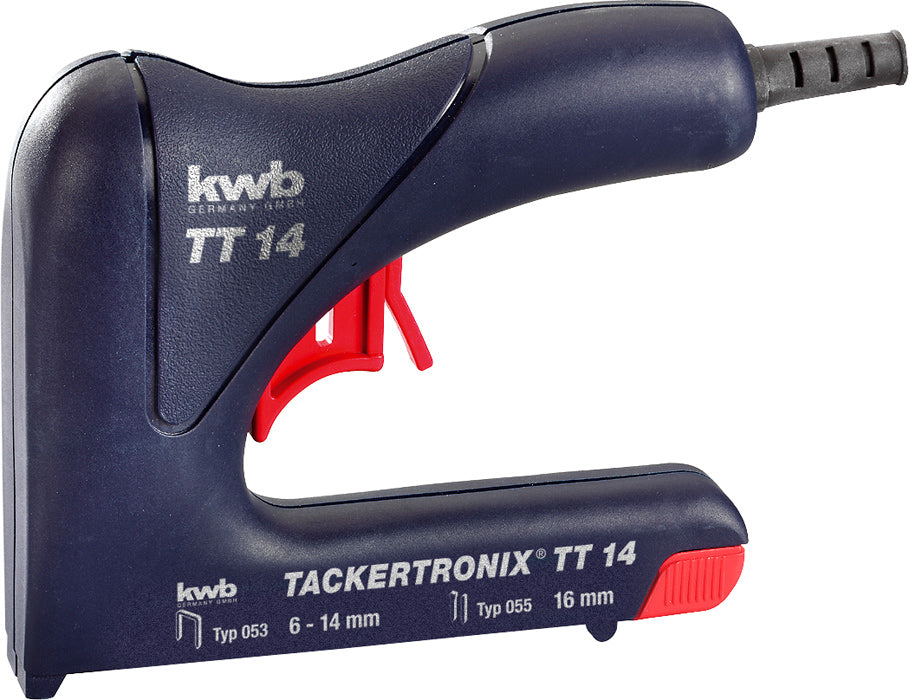 Der kwb Elektrotacker TACKERTRONIX TT 14 mit extra hoher Schlagkraft verfügt über einen Sicherheitshebel gegen unbeabsichtigtes Auslösen. Der Tacker für Heftklammern vom Typ 053 bis 14 mm Länge und Nägel vom Typ 055 bis 16 mm Länge hat eine Schlagfolge von 20/min.