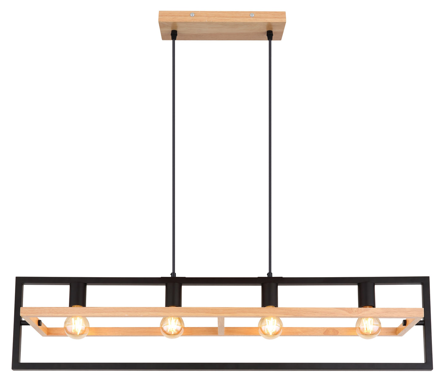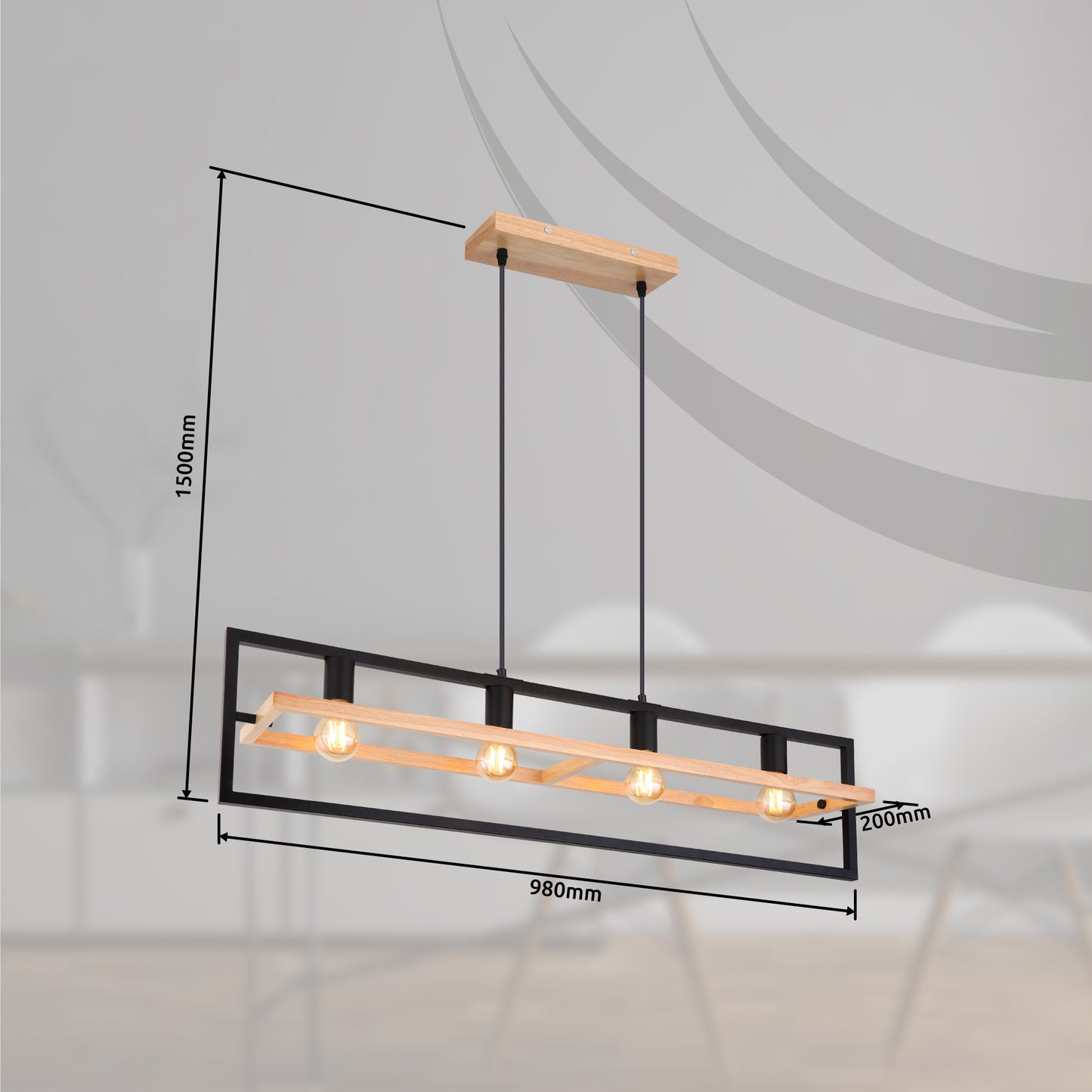 Diese äußerst moderne Deckenleuchte aus der Serie Erica begeistert durch Ihr tolles Design. Diese besteht aus einem schwarz matt rechteckigen Metallgerüst mit einer Länge von 98cm an dem sich vier E27 Fassungen befinden und von einem weiteren beweglichen Rechteck aus Holz mit einer Breite von 20cm umkreist wird. Von einer rechteckigen Deckenhalterung aus Holz hängt die Leuchte an zwei Metallstäben 1,5m von der Decke. Die E27 Fassungen ermöglichen Ihnen die freie Auswahl, bis zu einer maximalen Leistung von 40 Watt, zu bestücken.