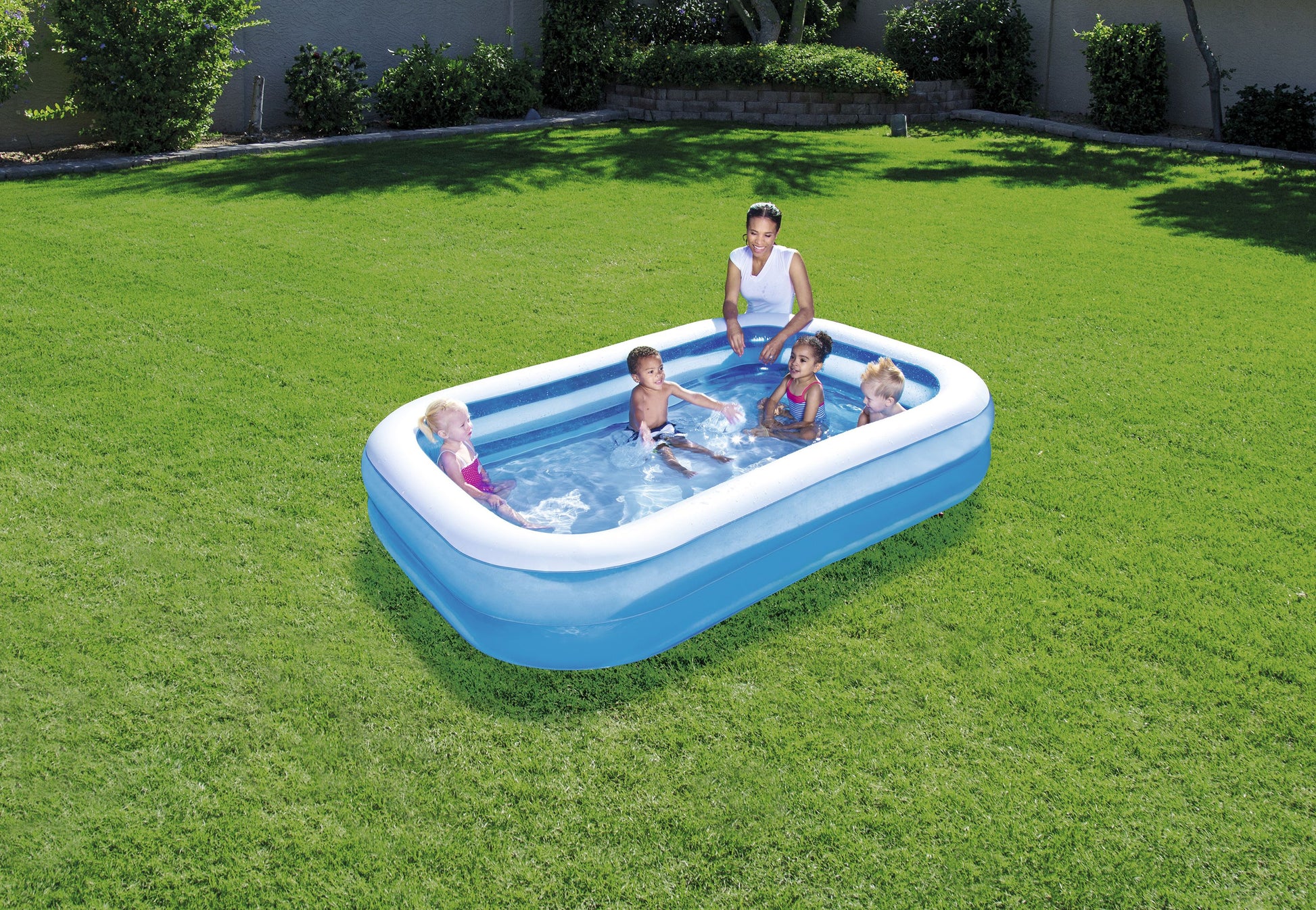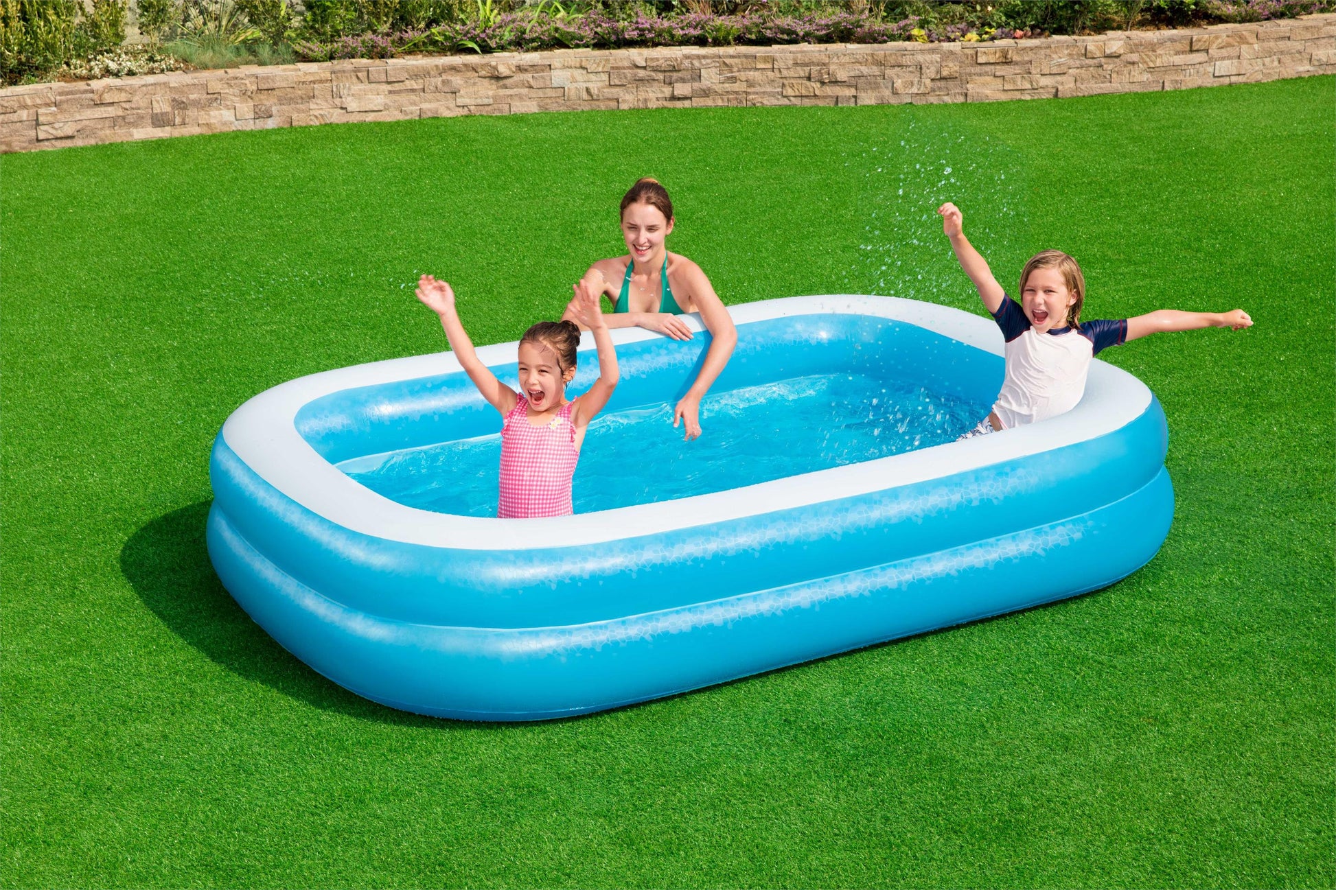 " Größe aufgeblasen: 262 x 175 x 51 cm " Größe unaufgeblasen: 248 x 163 cm " Altersempfehlung: ab 6 Jahren " Wasserkapazität: 778 Liter " Farbe: blau " Stabile Konstruktion aus 2 Luftringen " Extra breite Seitenwände " Musterung auf den Außenwänden " 2 Schnellverschlussventile " Integriertes Ablassventil " Inklusive selbstklebendem Reparaturflicken " Farbkarton " VE: 3 / 14,511 kg brutto