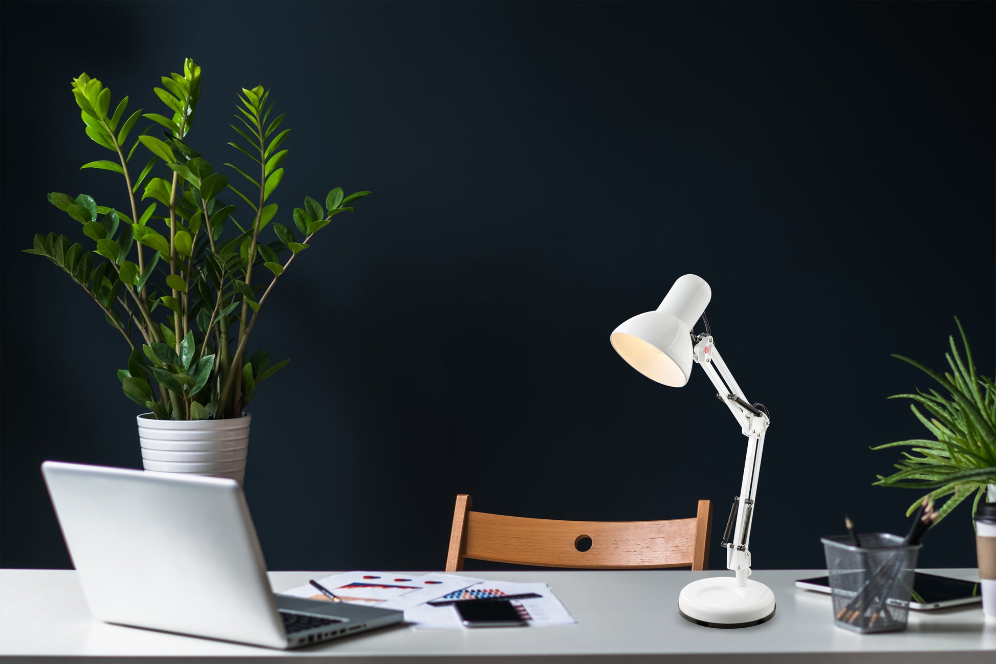 Diese weiße Tischleuchte ist die ideale Ergänzung für jeden Schreibtisch. Sie ist sehr sparsam, da LED-Leuchtmittel verwendet werden können. Drei Gelenke erlauben eine optimale Ausrichtung des Lichtscheins, um ein entspanntes Arbeiten zu ermöglichen.