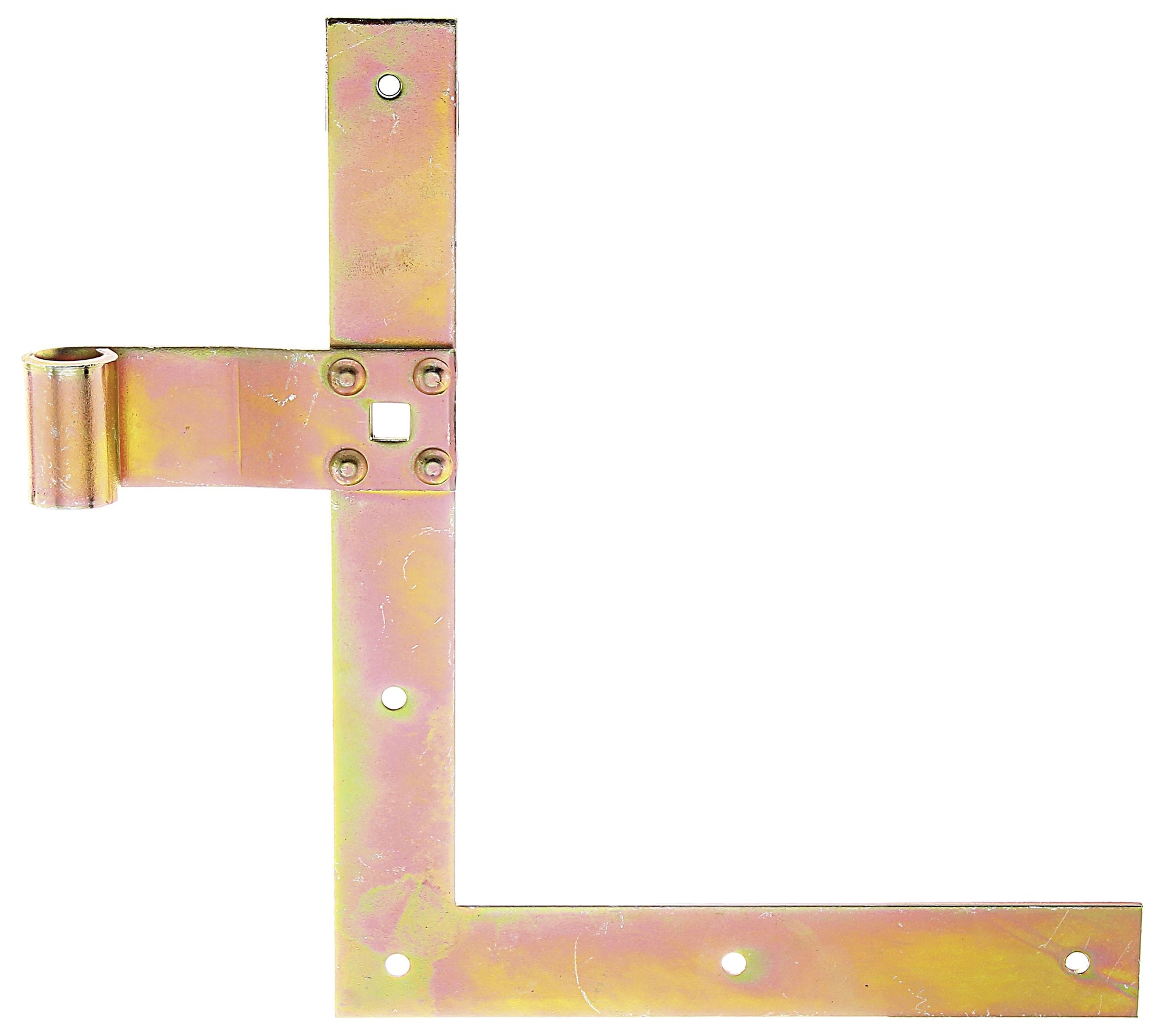 Fensterladen-Winkelband, gerade, Abschluss gerade, Material: Stahl roh, Oberfläche: galvanisch gelb verzinkt, Höhe: 250 mm, Länge: 200 mm, Rollen-#: 13 mm, Breite: 30 mm, Abstand Mitte Band - Mitte Rolle: 75 mm, Artikelbeschreibung: unten, Materialstärke: 3,00 mm, Anzahl Löcher: 5 / 1, Loch: #5,5 / 9 x 9 mm