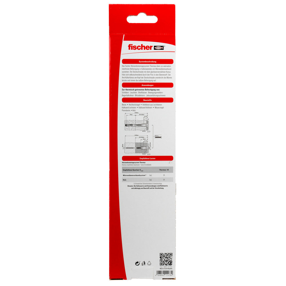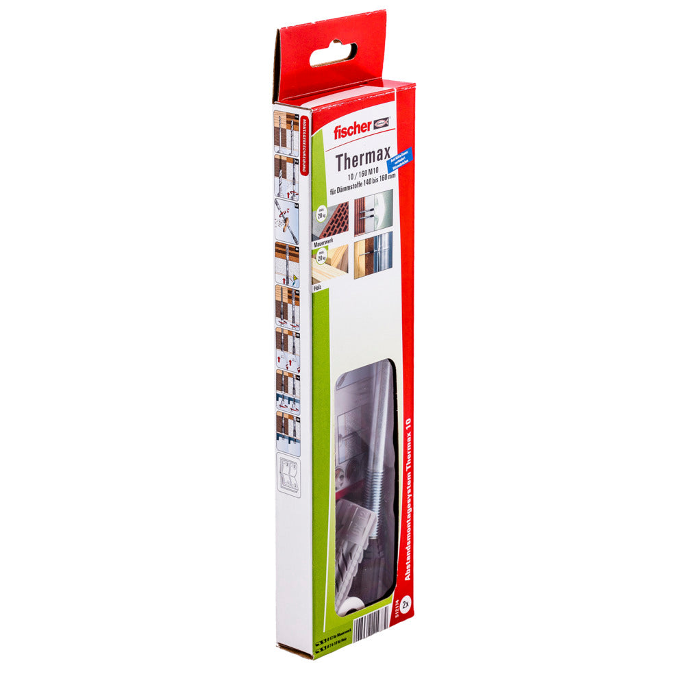 Das fischer Abstandsmontagesystem Thermax 10 ist eine Lösung zur Befestigung in der Außenwand ohne Wärmebrücken im WDVS. Die Stockschraube mit dem glasfaserverstärkten Konus fräst sich selbstschneidend durch den Putz in den Dämmstoff. Die Stockschraube wird bei der Montage in den Universaldübel UX gedreht und verankert somit sicher im Baustoff. Der Anti-Kälte-Konus am Kopf der Stockschraube unterbricht die Wärmebrücke und nimmt die äußere Befestigung auf. Der Thermax befestigt leichte Lasten wie Leuchten, Briefkästen oder Blitzableiter in Beton, Porenbeton und Mauerwerk aus Loch- und Vollstein.