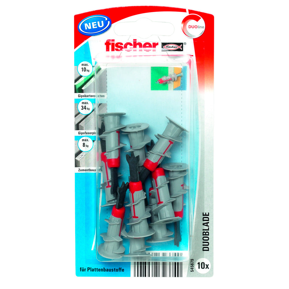 Der fischer DuoBlade ist Teil der innovativen DuoLine und besteht somit aus mehreren Komponenten für bestmögliche Performance. Die selbstbohrende Bohrspitze ermöglicht einen sauberen und effektiven Bohrvorgang. Der Dübel wird in der Vorsteckmontage mit einem Akku-Schrauber oder Schraubendreher oberflächenbündig in die Gipskartonplatten eingedreht. Der fischer DuoBlade ist abgestimmt auf Holz-, Blech- und Spanplattenschrauben von 4 bis 5 mm Stärke sowie unterschiedlichen Haken und Ösen. Dadurch ist er universell geeignet, um z.B. Rauchmelder, Vorhangstangen und Jalousien sicher und schnell zu befestigen. Der DuoBlade wird mit einem herkömmlichen PZ 2 Antrieb in die Gipskartonplatte gesetzt. Es wird kein Sonder-Setzgerät benötigt. Die selbstbohrende Bohrspitze ermöglicht einen sauberen und effektiven Bohrvorgang. Der Dübel wird in der Vorsteckmontage mit einem Akku-Schrauber oder Schraubendreher oberflächenbündig in die Gipskartonplatten eingedreht. Der fischer DuoBlade ist abgestimmt auf Holz-, Blech- und Spanplattenschrauben von 4 bis 5 mm Stärke sowie unterschiedlichen Haken und Ösen. Dadurch ist er universell geeignet, um z.B. Rauchmelder, Vorhangstangen und Jalousien sicher und schnell zu befestigen. Der DuoBlade wird mit einem herkömmlichen PZ 2 Antrieb in die Gipskartonplatte gesetzt. Es wird kein Sonder-Setzgerät benötigt.