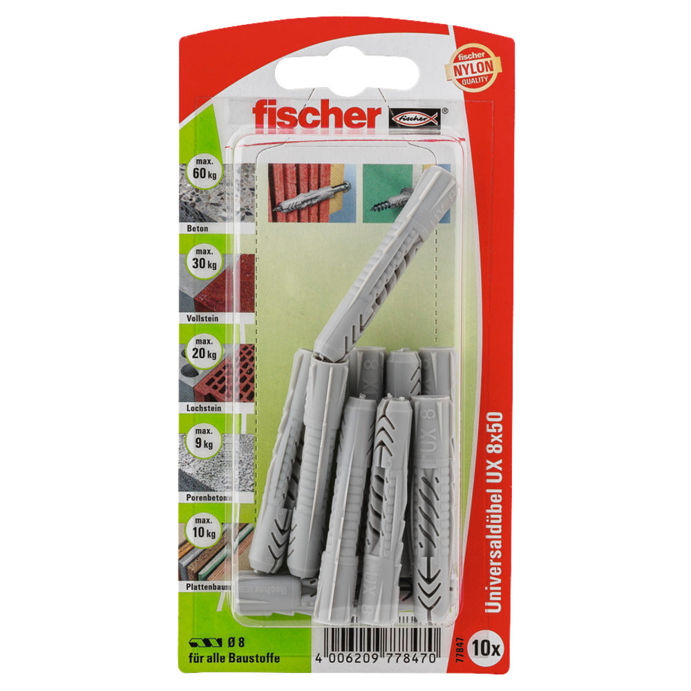 Der fischer Universaldübel UX ist der Allrounder aus hochwertigem Nylon. Der Dübel hält in Beton, aber auch in Porenbeton, in Mauerwerk und Gipskarton- sowie Gipsfaserplatten. In diesen Baustoffen verknotet der Dübel. Mit dem fischer Universaldübel UX lassen sich beispielsweise Leuchten, Gardinenschienen, leichte Schränke und Sockelleisten befestigen.