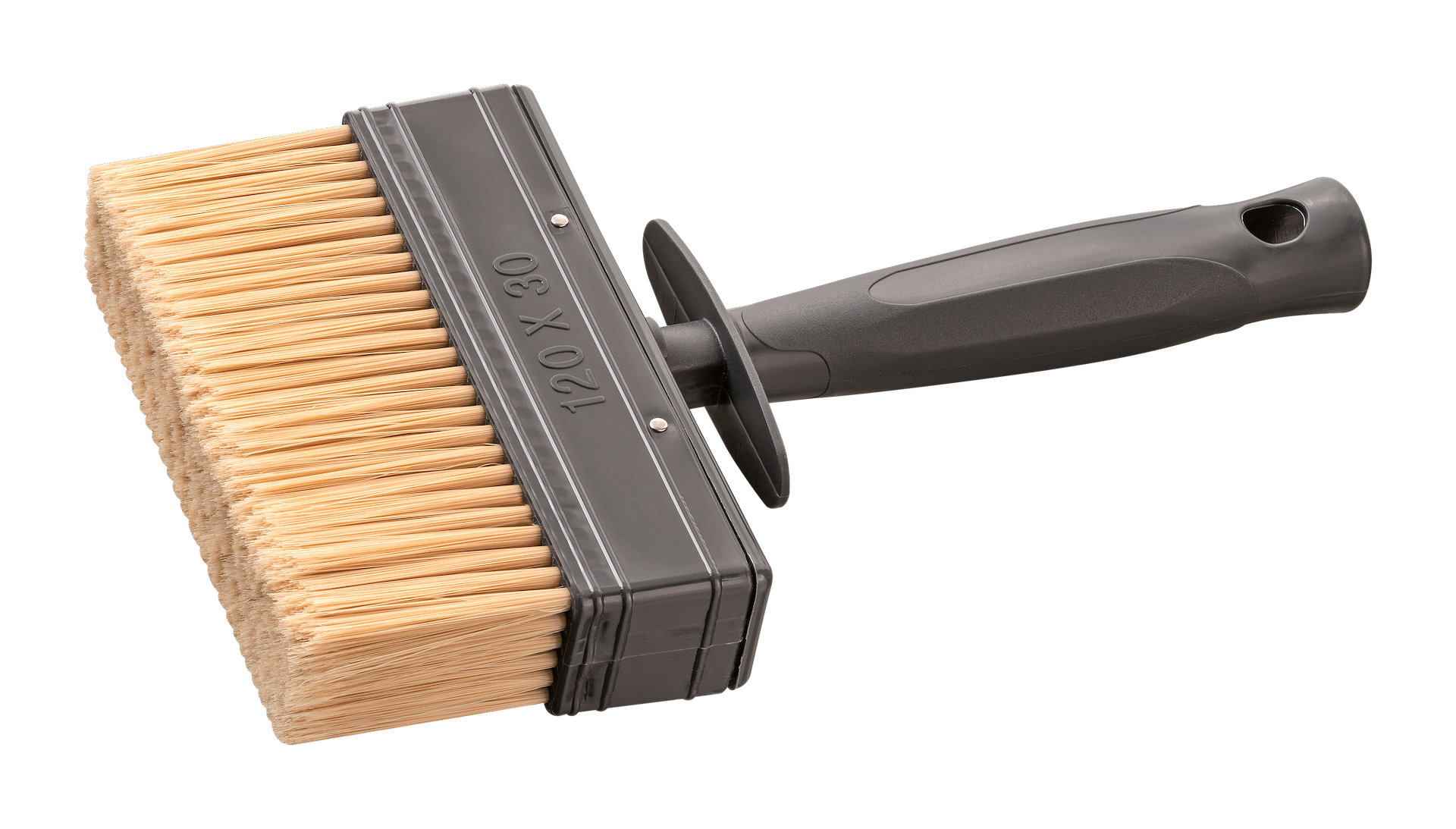 Flächenstreicher Standard: Mit Kunststoff-Körper und -stiel, beidseitigem Eimerhaken und Bajonetverschluss. Für den Auftrag von Wand- und Deckenfarben. Breite: 100 mm, Dicke: 30 mm, Borstenlänge: 44 mm PET-Mixborste 60% Tops, hell