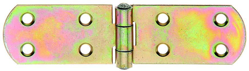 Kistenband, mit vernietetem Stift, mit versenkten Schraublöchern, Material: Stahl roh, Oberfläche: galvanisch gelb verzinkt, Länge: 156 mm, Breite: 35 mm, Materialstärke: 2,00 mm, Anzahl Löcher: 8, Loch: #5,5 mm