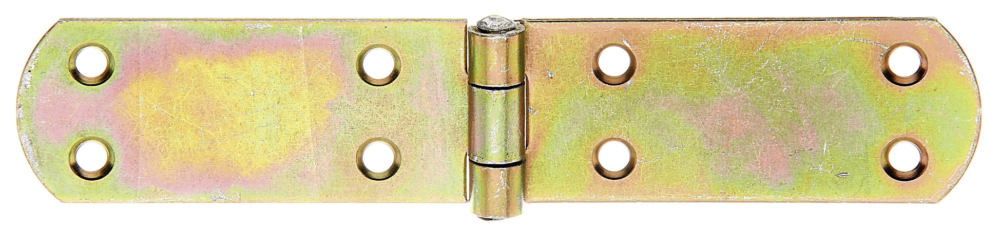 Kistenband, mit vernietetem Stift, mit versenkten Schraublöchern, Material: Stahl roh, Oberfläche: galvanisch gelb verzinkt, Länge: 175 mm, Breite: 35 mm, Materialstärke: 2,00 mm, Anzahl Löcher: 8, Loch: #5,5 mm