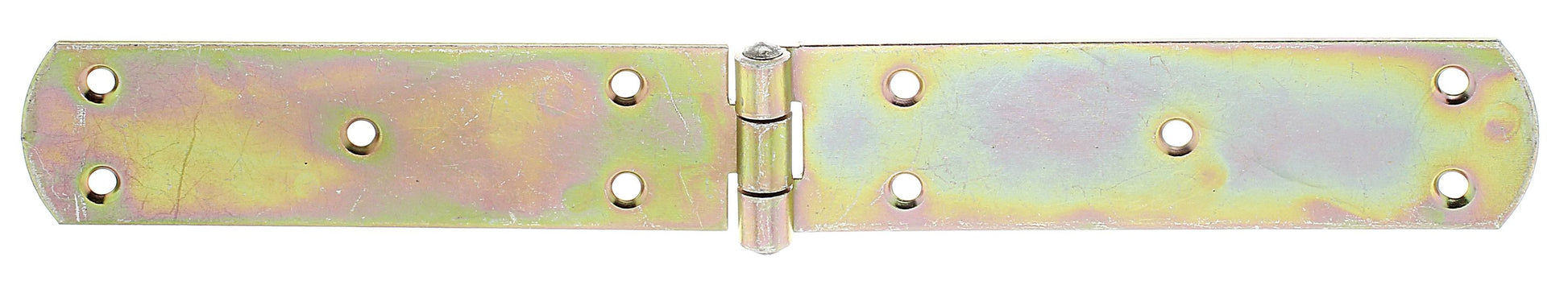 Kistenband, mit vernietetem Stift, mit versenkten Schraublöchern, Material: Stahl roh, Oberfläche: galvanisch gelb verzinkt, Länge: 300 mm, Breite: 40 mm, Materialstärke: 2,50 mm, Anzahl Löcher: 10, Loch: #5,5 mm