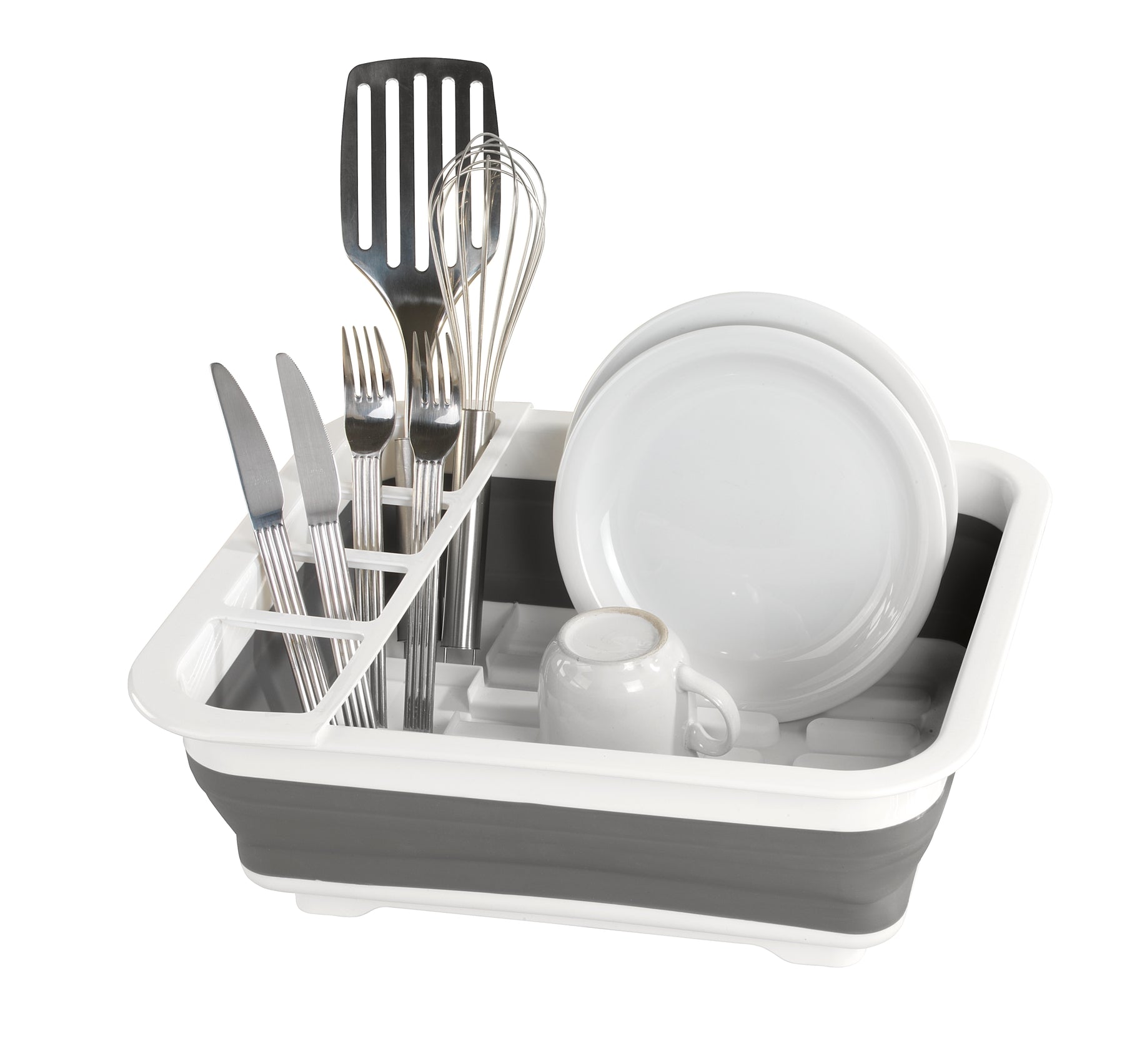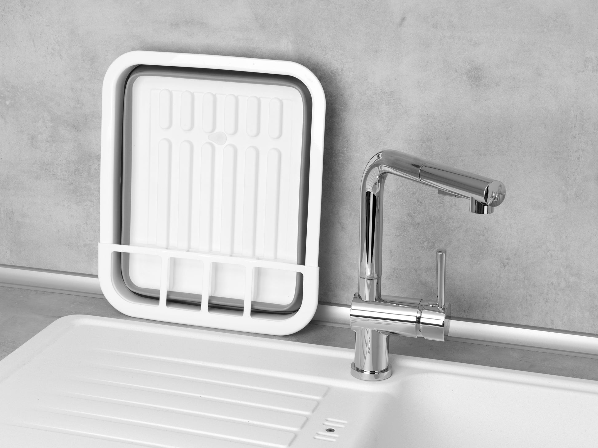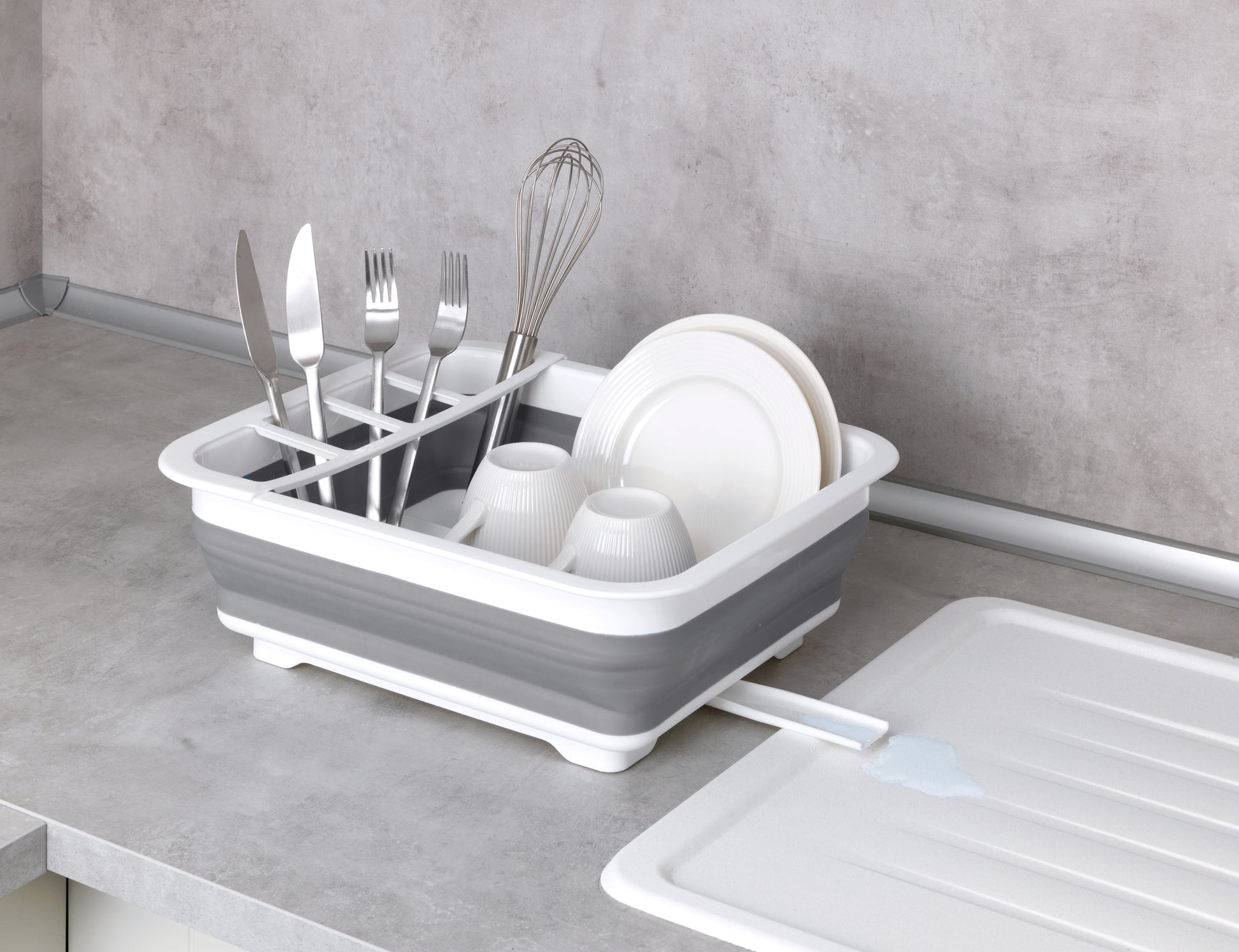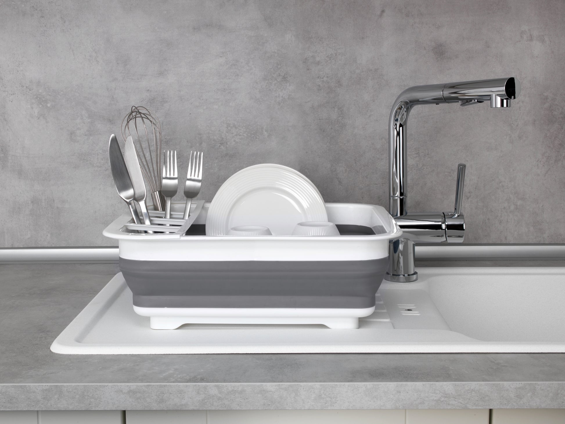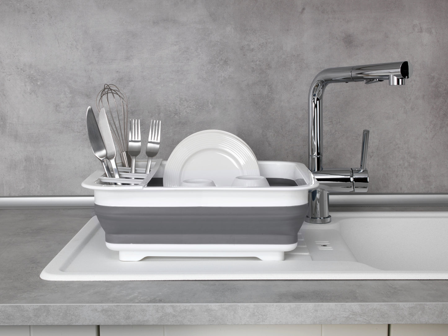 Da es auch im Zeitalter der Spülmaschine immer noch Geschirr und Besteck gibt, das besser von Hand gespült werden sollte, dient dieser zuverlässiger Abtropfständer als funktionelles Zubehör für die Spüle in Küche, Gartenhaus oder Wohnmobil. Das praktische Geschirrabtropfgestell bietet mit seiner großen Ablagefläche viel Platz für Teller, Tassen, Messer und Gabeln Der Geschirrabtropfer ist rutsch- und kratzfest und bietet einen sicheren Stellplatz für Teller, Tassen und eine separate Vorrichtung für das Besteck. Der ausziehbare Ablauf vereinfacht das Abgießen von Wasser und erleichtert die Reinigung. Dabei bleibt die Arbeitsplatte stets trocken. Das handliche Abtropfgestell ist im modernen Grau/Weiß gehalten und lässt sich bei Nichtgebrauch platzsparend zusammenfalten.