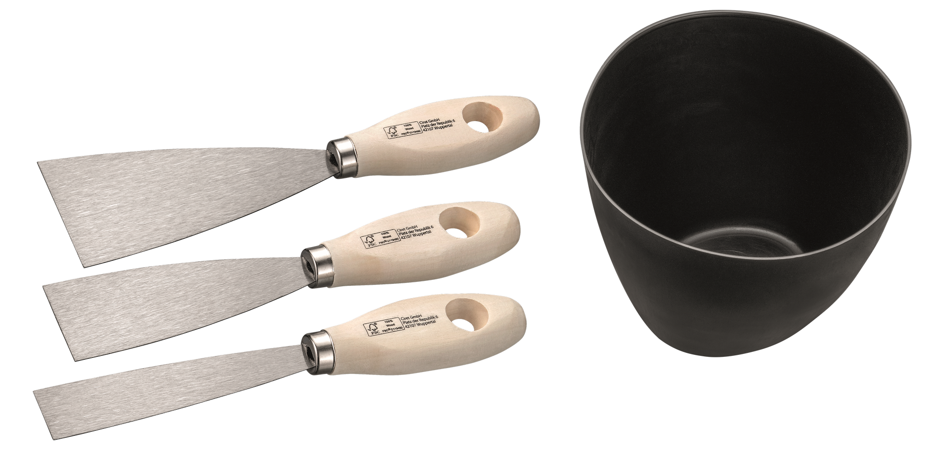 Umfangreiches Set zum Füllen und Glätten von Unebenheiten. Inklusive drei Spachteln und Gipsbecher. Breite: 25, 40 und 60 mm Material: halbflexibles Stahlblatt -: -