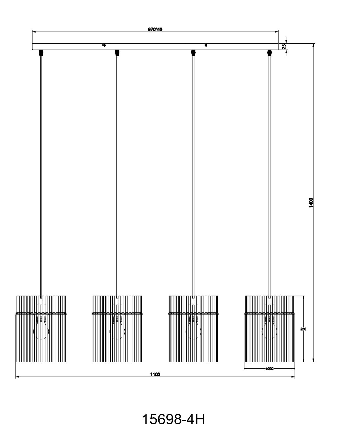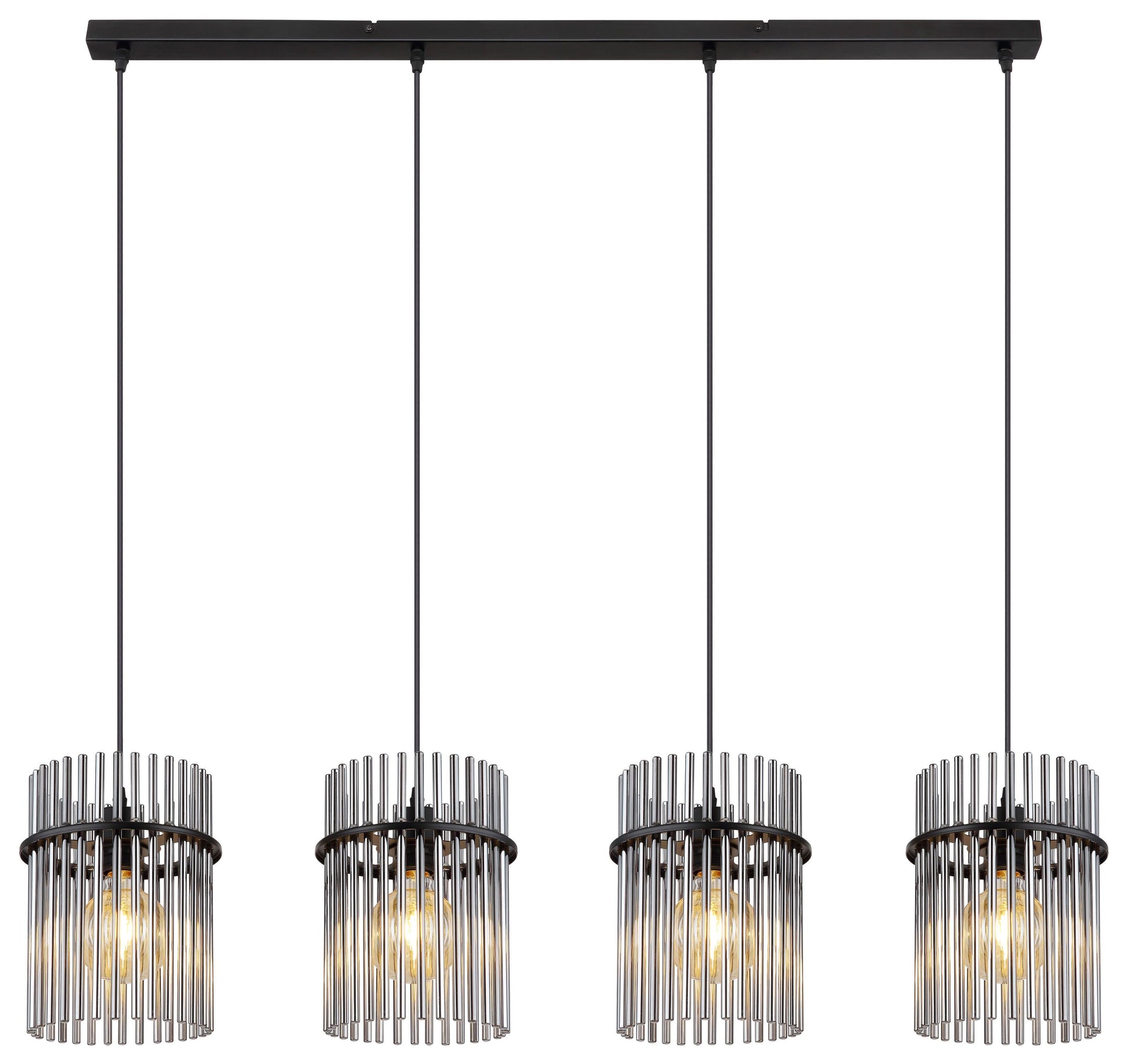 Diese elegante Hängeleuchte der Gorley Serie begeistert durch modernes Design. Aus einer rechteckigen Deckenbefestigung verlaufen vier bis zu 1,4 m lange schwarze Kabel zu jeweils einer E27 Fassung. Diese sind mit formschönen zylinderförmigen Schirmen aus Glasstäben bestückt und überlassen Ihnen die Möglichkeit, bis zu einer maximalen Leistung von 60 Watt, selbst über Lichtfarbe und Helligkeit zu bestimmen. Aufgrund von Langlebigkeit und Stromersparnis empfehlen wir LED Leuchtmittel.