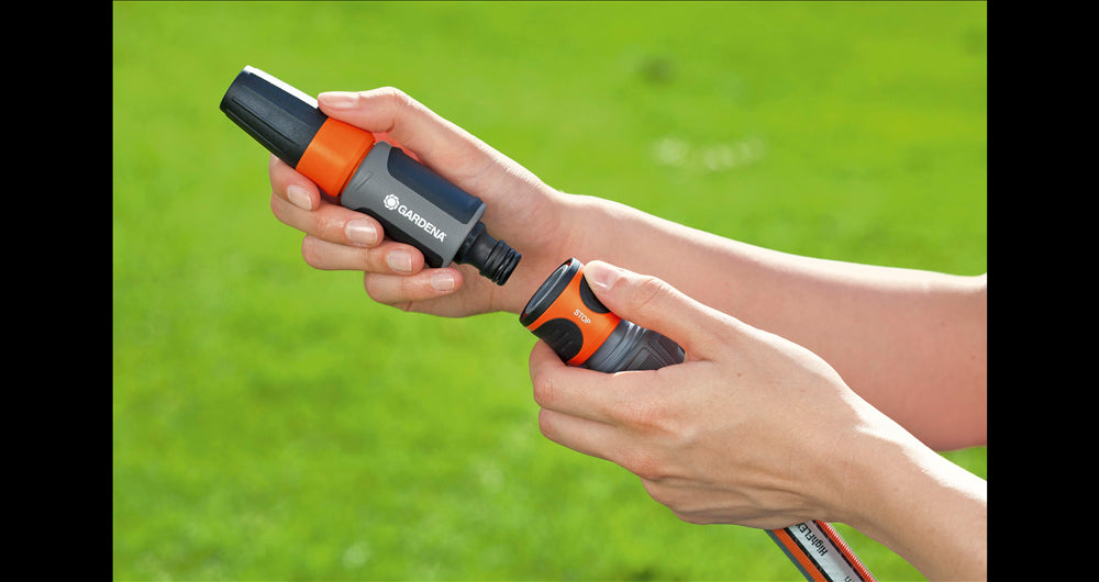 Der Wasserstop ermöglicht das Wechseln zwischen verschiedenen Aufsätzen, ohne zum Wasserhahn gehen zu müssen. Das Wasser stoppt automatisch beim Abziehen der Spritze und setzt wieder ein, sobald ein neuer Aufsatz aufgesteckt wird.