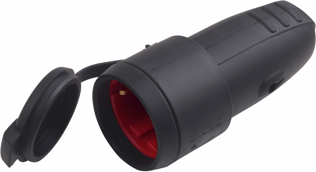 schwarz, Material: Gummi, mit zentraler Kabeleinführung, für Leitungsquerschnitt bis 2,5 mm², IP44 spritzwassergeschützt, zur Anwendung in feuchten Räumen geeignet, 16 A, 250 V~