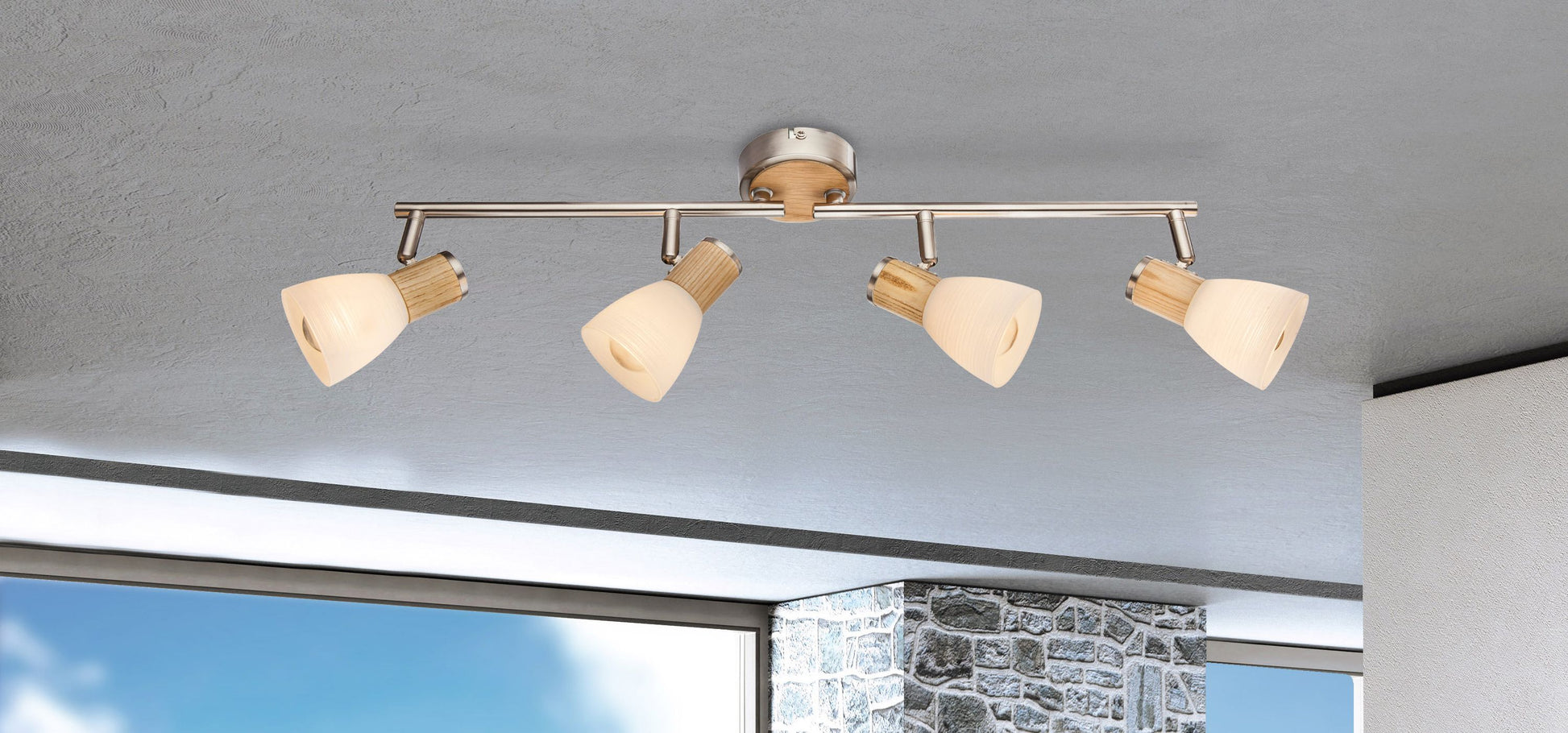 Dieser vierflammige Strahler, der Deckenlampenserie Gylfi, ist mit vier E14 Fassungen, für je max. 40W ausgestattet und ermöglicht Ihnen, ein beliebiges Leuchtmittel zu nutzen. Aufgrund ihrer Stromersparnis und Langlebigkeit, empfehlen wir LED-Lampen. Die Material- bzw. Farbkombination aus Holz und Nickel Matt, macht diesen Deckenstrahler zum Blickfang in Ihrem Wohnbereich. Die vier verstellbaren Spots, montiert auf zwei beweglichen Armen, bringen Licht in die dunkelsten Ecken. Mit Wand- und Deckenlampen der gleichen Modellserie, können Sie das Bild in Ihrem Wohnbereich komplettieren.