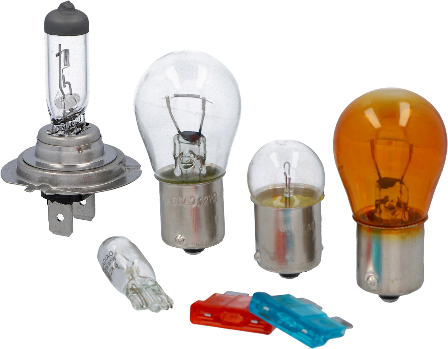 Komplett-Lampenset für Scheinwerfer-, Abblend-, Blink- und Bremslicht, Schlussleuchte sowie Sicherungen, gehören in jedes Handschuhfach.