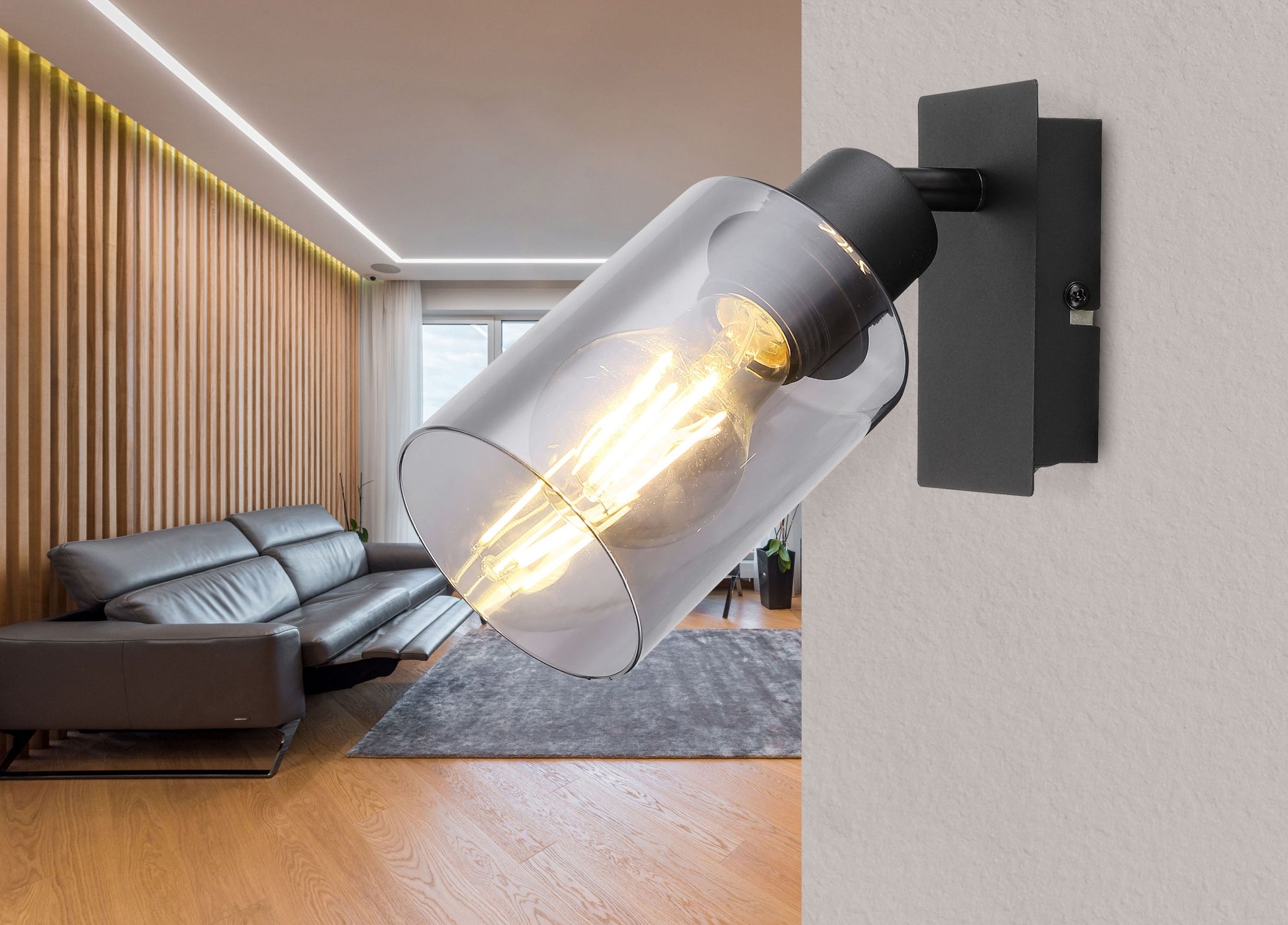Dieser schöne Strahler der Serie Hadera kombiniert schlichtes mit modernem Design. An einer schwarz matten Wandbefestigung (9x20cm) befindet sich mit einem Überhang von 18cm eine verstellbare E27 Fassung, bestückt mit einem schönen zylinderförmigen Schirm (Ø9cm) in Rauchfarben. Die E27 Fassung überlässt Ihnen die Möglichkeit, bis zu einer maximalen Leistung von 40 Watt, selbst über Lichtfarbe und Helligkeit zu entscheiden. Durch weitere Modelle dieser Serie können Sie Ihren Wohnbereich perfekt ergänzen.