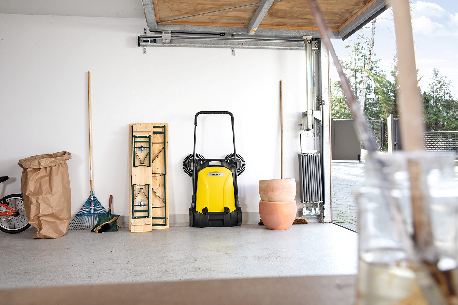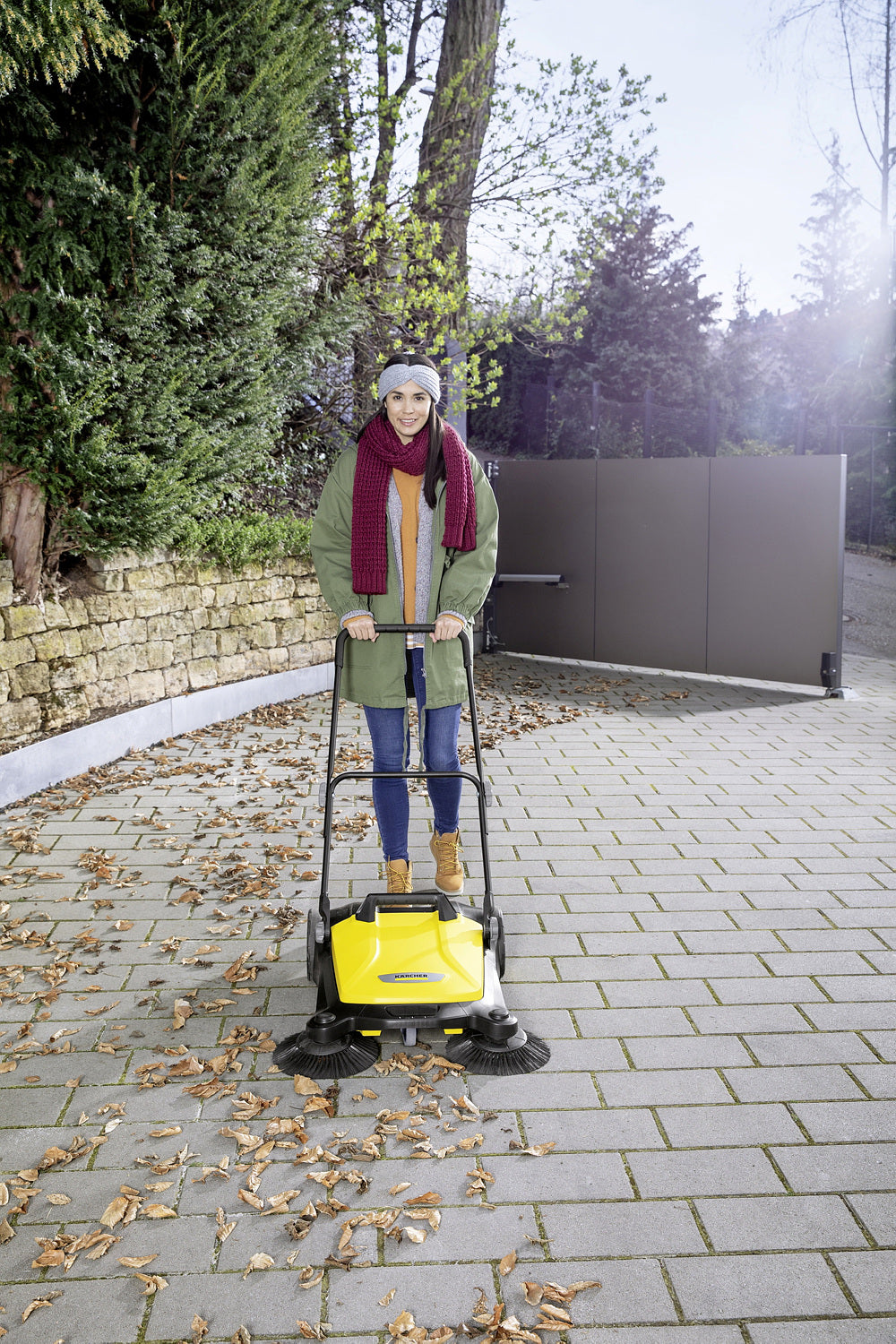Ob Blütenblätter im Frühling, Sand im Sommer, Laub im Herbst oder Streugut im Winter: Die effektive und ergonomische Kehrmaschine S 4 Twin von Kärcher sorgt ganzjährig in Rekordtempo für glanzvolle Zeiten rund um Haus und Garten. Mit ihrer kräftigen Kehrwalze, ihren 2 Seitenbesen und einer Kehrbreite von insgesamt 680 Millimetern kehrt sie mühelos Flächen von bis zu 2400 m² pro Stunde. Die Maschine befördert das Kehrgut direkt in den 20 Liter fassenden Kehrbehälter. Die langen Borsten der Seitenbesen sorgen für gründliche Sauberkeit bis zum Rand. Der stufenlos höhenverstellbare Schubbügel lässt sich optimal auf die Körpergröße des jeweiligen Anwenders anpassen. Dank des verwendeten Bajonettverschlusses kann bei der Höhenverstellung auch keine Schraube mehr verloren gehen. Die Kehrmaschine kann bei Bedarf ohne Bücken ganz einfach durch eine Trittfläche am Rahmen komplett umgeklappt und am Handgriff getragen werden für eine platzsparende Aufbewahrung. Einzigartig ist die werkzeuglose Seitenbesenanbringung. So ist die Kehrmaschine im Nu einsatzbereit. Der Kehrgutbehälter lässt sich leicht entnehmen und kann ohne Schmutzkontakt sicher abgestellt und entleert werden.