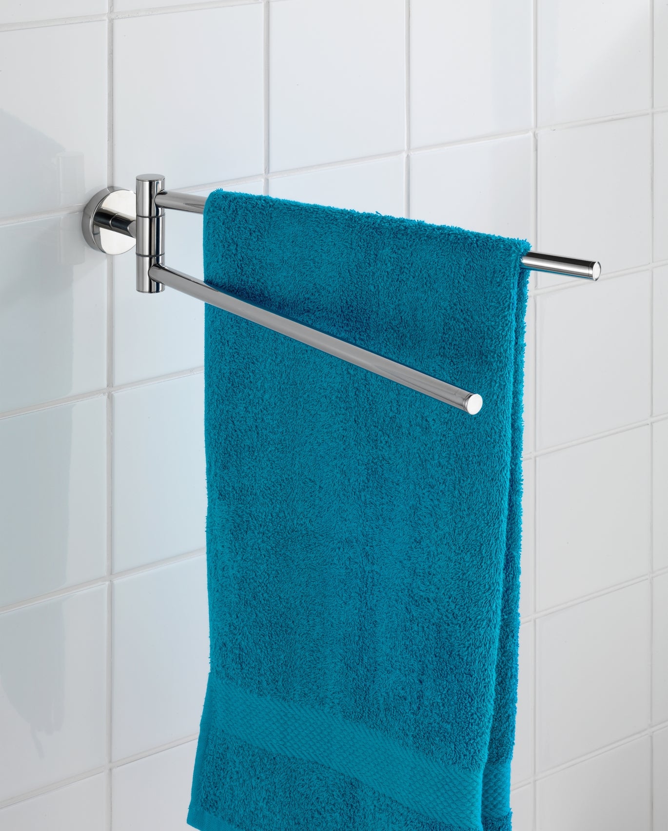 In einem liebevoll eingerichteten Zuhause darf es an Ordnung nicht fehlen. Am schönsten ist es, wenn im Badezimmer alles seinen Platz hat. Hier beginnt der Tag – und das möglichst ohne Stress und langes Herumsuchen dank WENKO. Die trendige Bad-Serie Bosio von WENKO bringt stilvolle Eleganz in jedes Bad und vereint Funktionalität und Qualität. Der hochwertige Handtuchhalter Bosio mit 2 Armen von WENKO löst schnell und einfach das Problem fehlender Aufhängemöglichkeiten bei wenig Platz im Badezimmer. Er benötigt zur Anbringung wenig Fläche und bietet mit den beiden übereinanderliegenden, schwenkbaren Armen eine ausreichend große Ablagemöglichkeit für zwei Handtücher. Die elegante Handtuchstange ist aus rostfreiem, schwarz mattiertem Edelstahl gefertigt. Verleihen Sie Ihrem Bad einen komplett neuen Look mit den vielen weiteren Bad-Accessoires der Bosio Black Serie. Die passenden Schrauben und Dübel zur stabilen Wandbefestigung sind im Lieferumfang bereits enthalten. Alternativ ist auch eine Befestigung ohne Bohren möglich. Separat erhältlich ist das Power-Loc Klebe-Set. Das Power-Loc Kammer-Klebesystem zeichnet sich durch extrem festen Halt auf allen tragfähigen Oberflächen, z.B. Fliesen, Naturstein, Glas, Beton, Metall, Holz und vielen Kunststoffen aus. Das Befestigungssystem hält problemlos auch auf rauen und leicht unebenen Oberflächen.