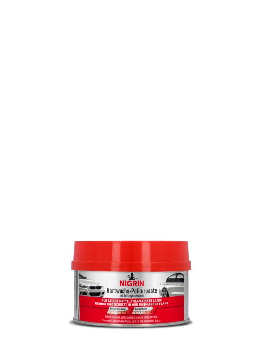 NIGRIN Hartwachs-Politurpaste reinigt, glättet und konserviert alle leicht matten, strapazierten Bunt- und Metallic-Lacke in nur einem Arbeitsgang. Durch den Anteil hochwertigen Carnauba-Naturwachses bildet sich eine langanhaltende, wasser- und schmutzabweisende Versiegelung des Lackes. Die pasteuse Konsistenz tropft und fließt nicht bei der Verarbeitung und ist auch auf nassem Lack anwendbar, was Ihren Pflegeaufwand erheblich reduziert. NIGRIN Hartwachs-Politurpaste sorgt nachhaltig für den Werterhalt und eine glänzende Optik Ihres Fahrzeugs, denn sie reinigt besonders materialschonend und gibt dem Lack die ursprüngliche Farbtiefe und seinen Glanz zurück. Sie ist auch für die maschinelle Verarbeitung geeignet.