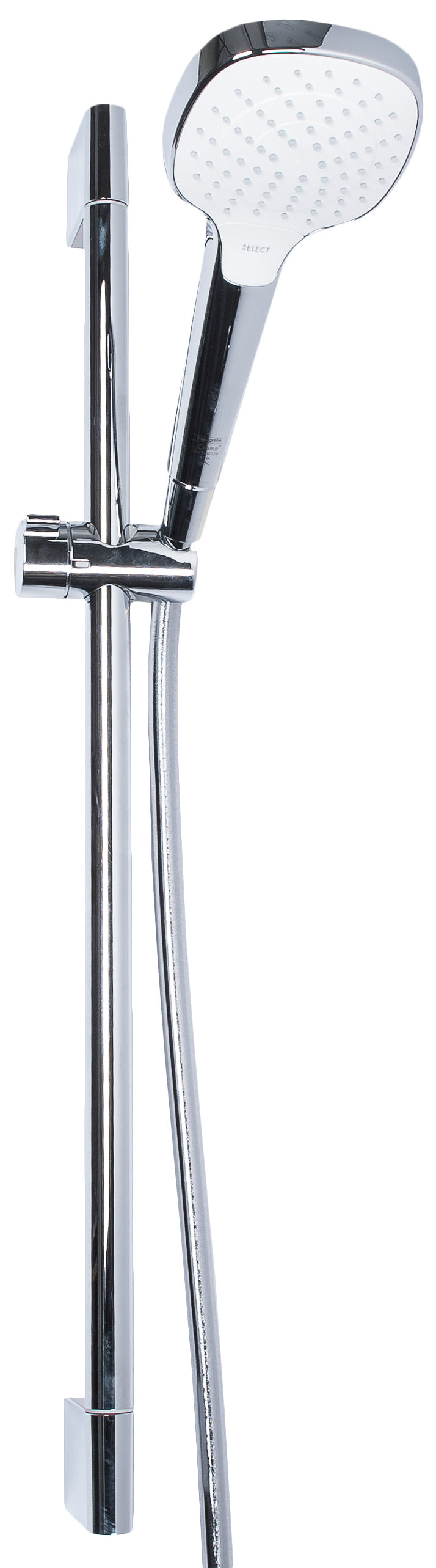 Strahlart: Rain, IntenseRain, TurboRain" Komfortable Strahlartenumstellung durch Select-Taste" Brausekopfgröße: 110 mm " Brauseseitiger Drehwirbel gegen lästiges Verdrehen des Brauseschlauches" Neigungswinkel um 90° verstellbar, Schieber schwenkt nach links und rechts sowie oben und unten" Maximale Durchflussmenge (bei 3 bar): 15 l/min" Fliesenausgleichsscheibe (grau)" Verchromte Wandstütze aus Kunststoff" Verchromt/weß