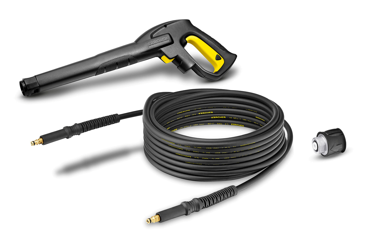 Zum Lieferumfang des Zubehörsets gehören ein 7,5-Meter-Hochdruckschlauch, eine ergonomische Hochdruckpistole und ein Adapterstück zur Nachrüstung der praktischen Schnellverbindung Quick Connect für die Klassen K 2-K 7. Geeignet für alle Kärcher Hochdruckreiniger ohne Schlauchtrommel ab Baujahr 1992.