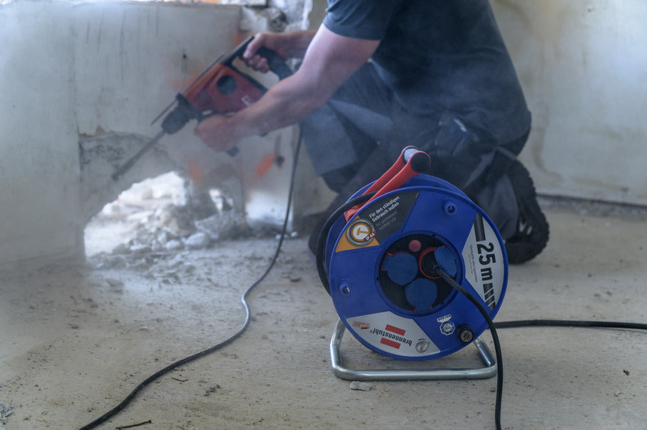 Die Garant IP44 Gewerbe-/Baustellen-Kabeltrommel mit 25m Kabellänge in der Farbe blau von Brennenstuhl überzeugt durch ihre Qualität und Sicherheit in allen Bereichen. Die Kabeltrommel eignet sich ideal für den Baustelleneinsatz und den Einsatz im Freien. Sie überzeugt außerdem durch folgende Eigenschaften: * Innovativer Tragegriff "cablepilot" für die perfekte Kabelführung. Pendelt auf beiden Seiten und ermöglicht bequemes Tragen und Aufhängen * RN-Kabel ist zugelassen für erschwerte Baubedingungen nach VDE 0100 Teil 704 * Mit Drehgriff für komfortables Aufrollen * Schutzart IP44 * Kabellänge 25m * Kabelbezeichnung H07RN-F 3G2,5 * Kabelqualität Gummi-Neopren * Kabelfarbe Schwarz * Trommeldurchmesser 290 mm